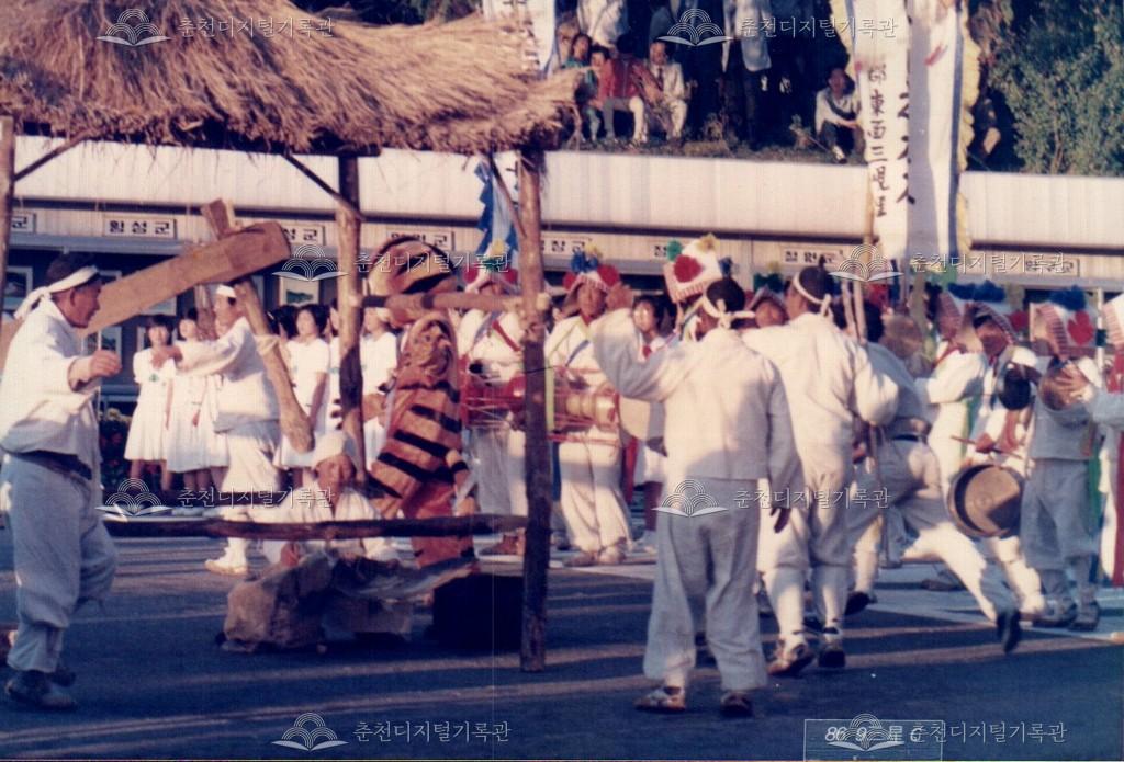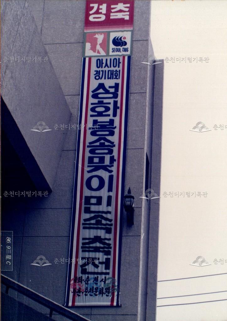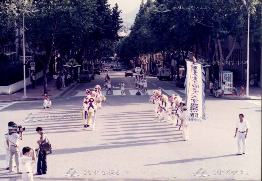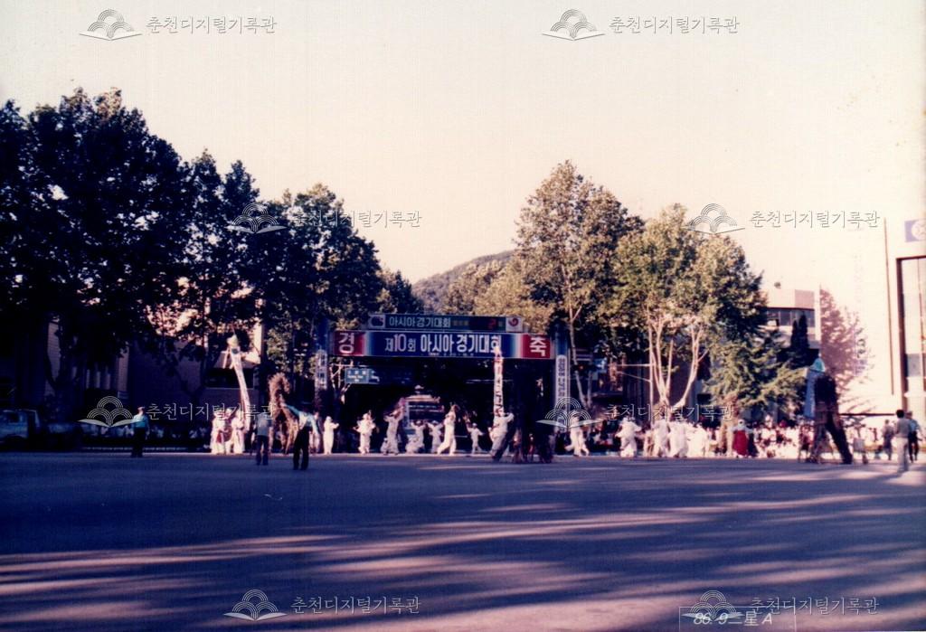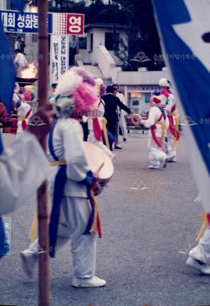 1986년 9월 18일, 19일간 진행된 제10회 아시아경기대회(서울아시안게임) 성화 봉송 관련 사진이다. 9월 20일부터 10월 5일까지 서울에서 개최되는 제10회 아시아경기대회의 성화 봉송이 중앙로터리, 도청앞광장 등 춘천 시내에서 진행되었다. 이와 관련하여 춘천시와 춘천문화원에서는 성화봉송맞이 민속축전을 진행하였으며 농악 길놀이, 마당놀이 등, 민속놀이를 선보였다.