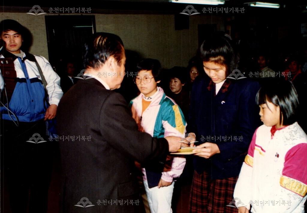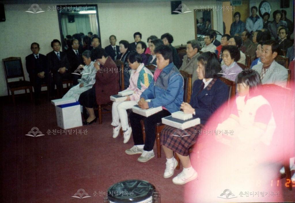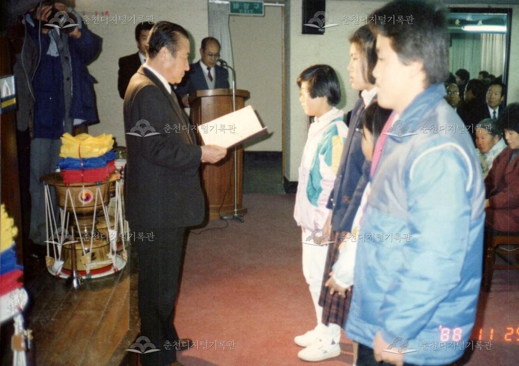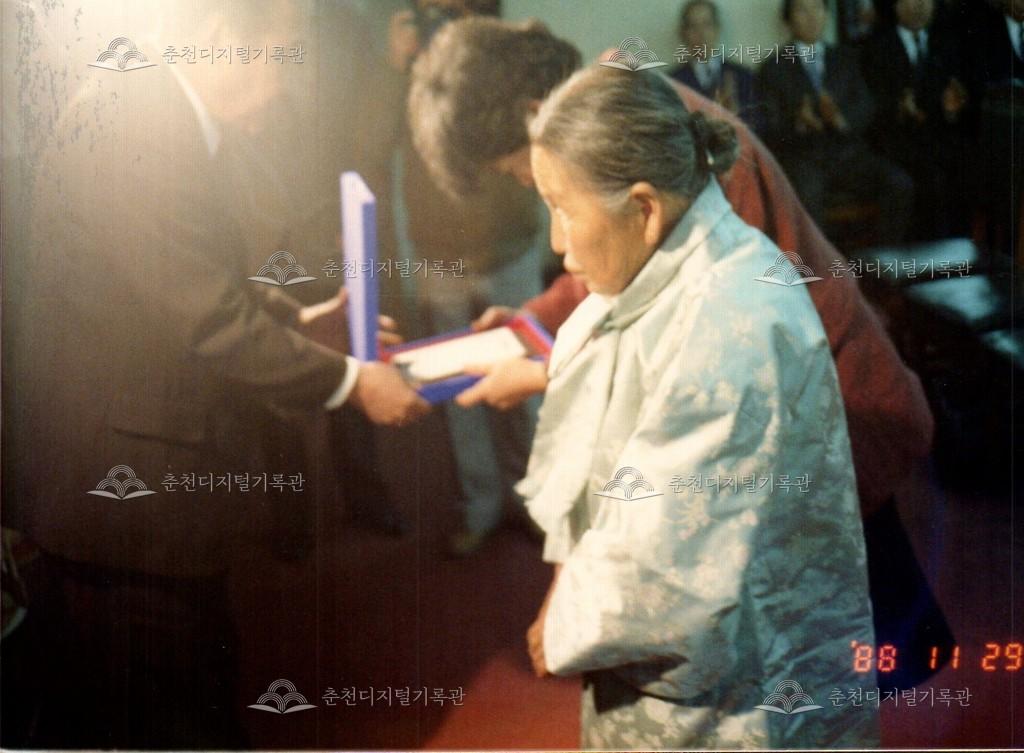 효행상 시상 및 농악기 기증식 사진 등록번호 00002323 생산일자 1988.11.29 생산지역 춘천시 생산자 춘천문화원 수집처 춘천문화원 소장자 춘천학연구소 내용 1988년 효행상 시상 및 농악기 기증식의 사진이다. 사용안내 비상업적 이용만 가능|©춘천디지털기록관 상업적 사용·수정·재배포는 저작권자 동의 필요 다운로드 목록보기