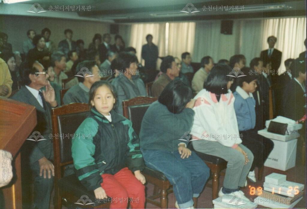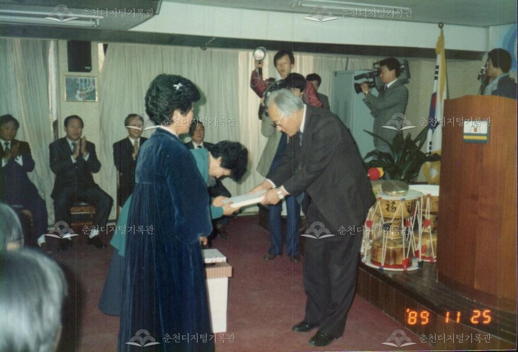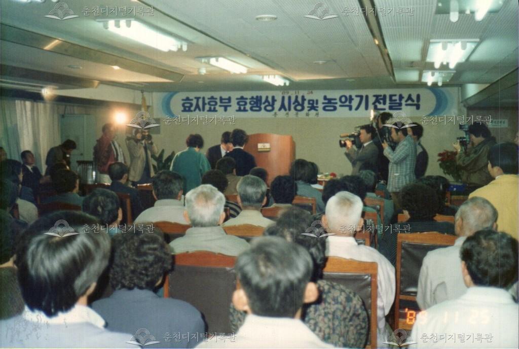 효자효부 효행상 시상 및 농악기 전달식 사진 등록번호 00002329 생산일자 1989.11.24 생산지역 춘천시 생산자 춘천문화원 수집처 춘천문화원 소장자 춘천학연구소 내용 1989년 효자효부 효행상 시상 및 농악기 전달식의 사진이다. 사용안내 비상업적 이용만 가능|©춘천디지털기록관 상업적 사용·수정·재배포는 저작권자 동의 필요 다운로드 목록보기