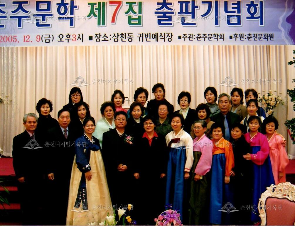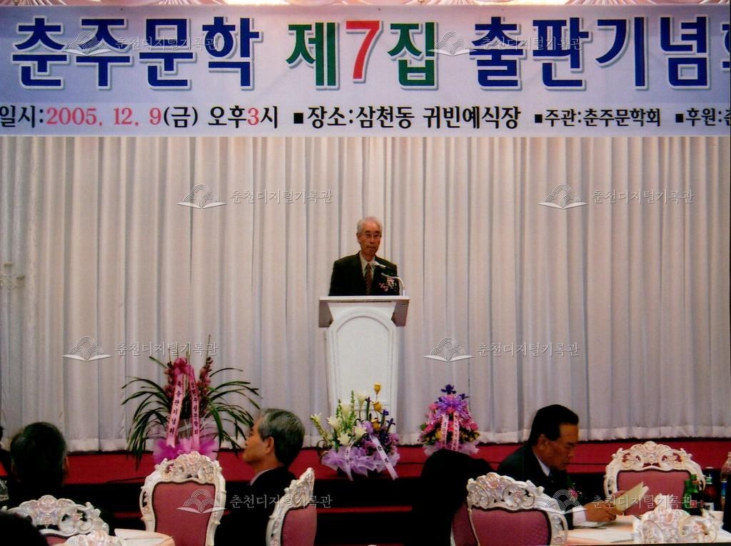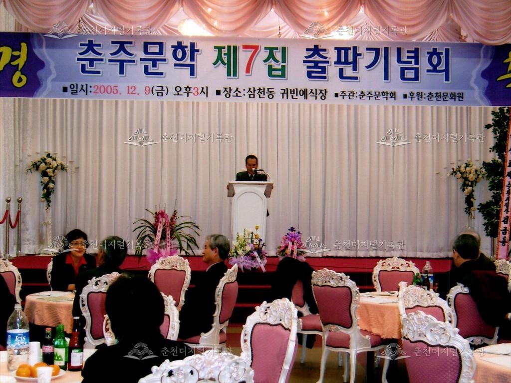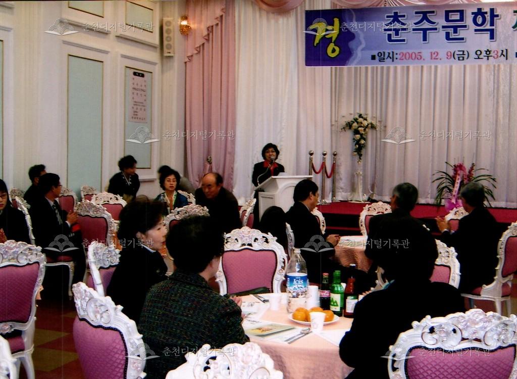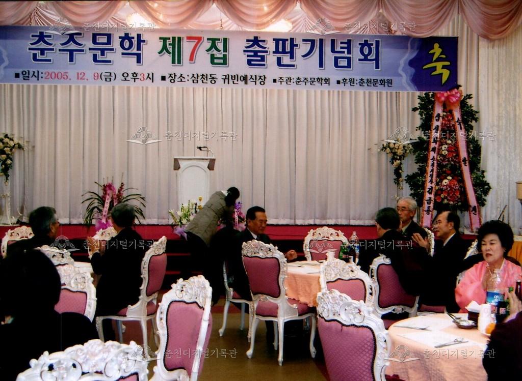 춘주문학 제7집 출판기념회 사진 등록번호 00002625 생산일자 2005.12.09 생산지역 춘천시 삼천동 생산자 춘천문화원 수집처 춘천문화원 소장자 춘천학연구소 내용 2005년 춘주문학 제7집 출판기념회 사진이다. 삼천동 귀빈예식장에서 진행되었다. 사용안내 비상업적 이용만 가능|©춘천디지털기록관 상업적 사용·수정·재배포는 저작권자 동의 필요 다운로드 목록보기
