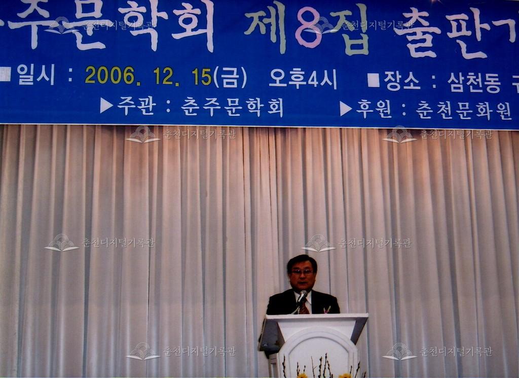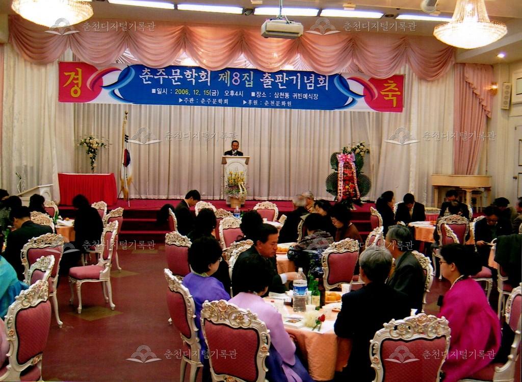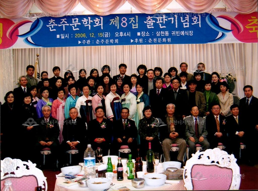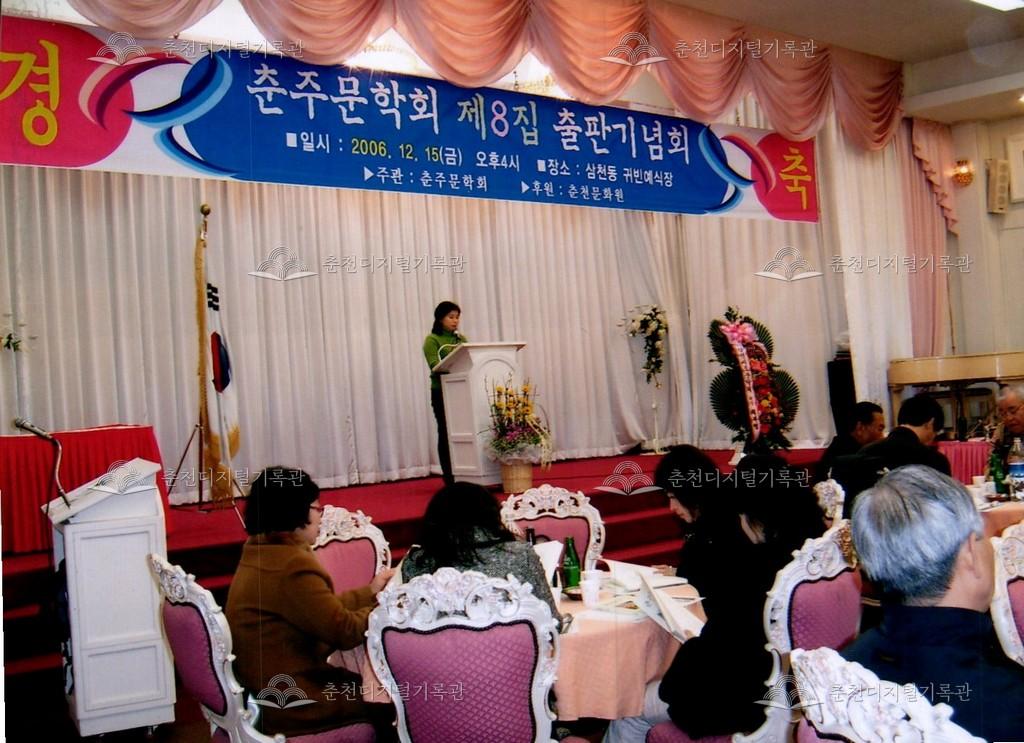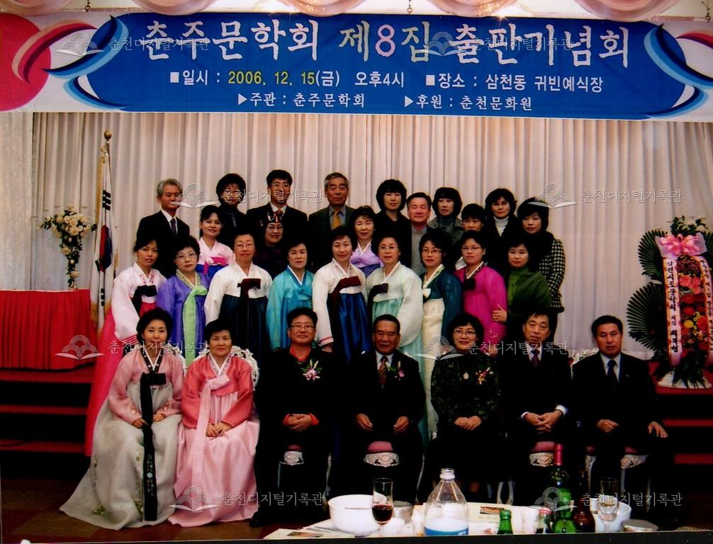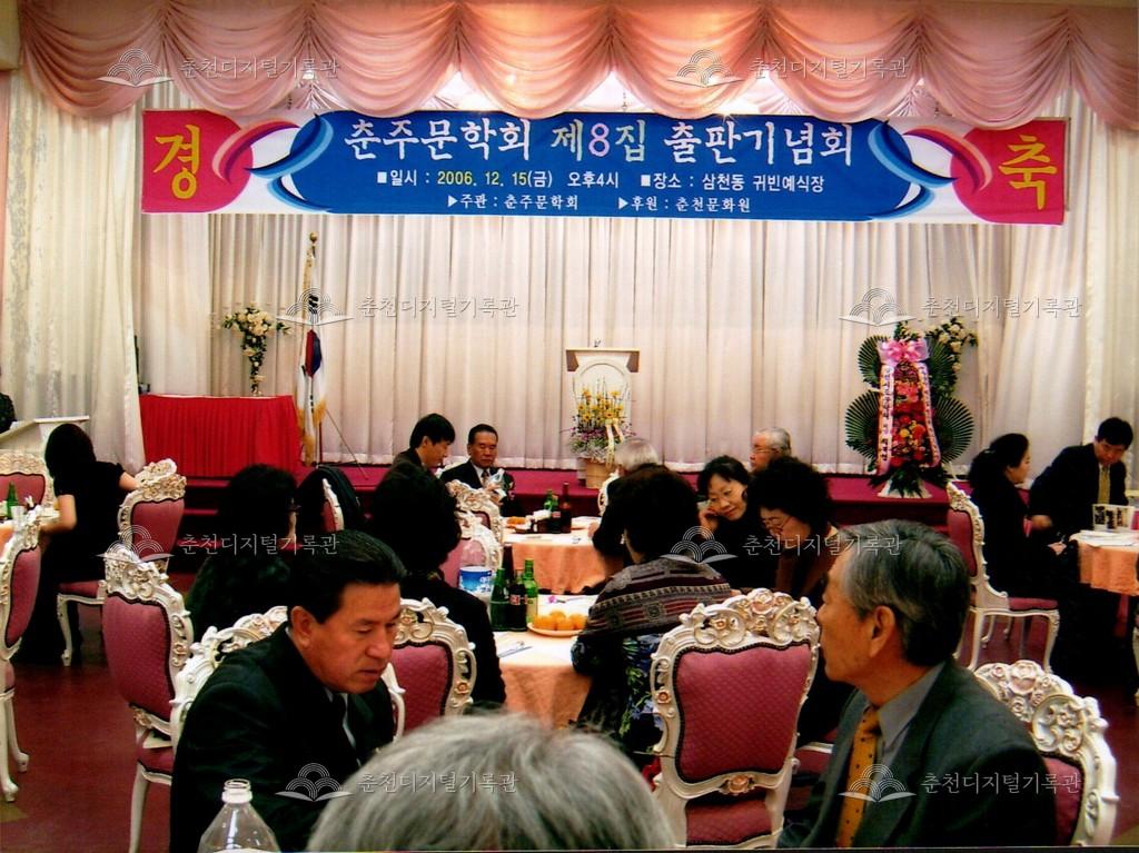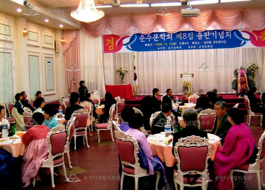 춘주문학회 제8집 출판기념회 사진 등록번호 00002658 생산일자 2006.12.15 생산지역 춘천시 삼천동 생산자 춘천문화원 수집처 춘천문화원 소장자 춘천학연구소 내용 2006년 춘주문학회 제8집 출판기념회 사진이다. 삼천동 귀빈예식장에서 진행되었다. 사용안내 비상업적 이용만 가능|©춘천디지털기록관 상업적 사용·수정·재배포는 저작권자 동의 필요 다운로드 목록보기