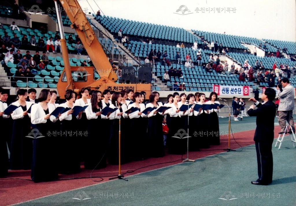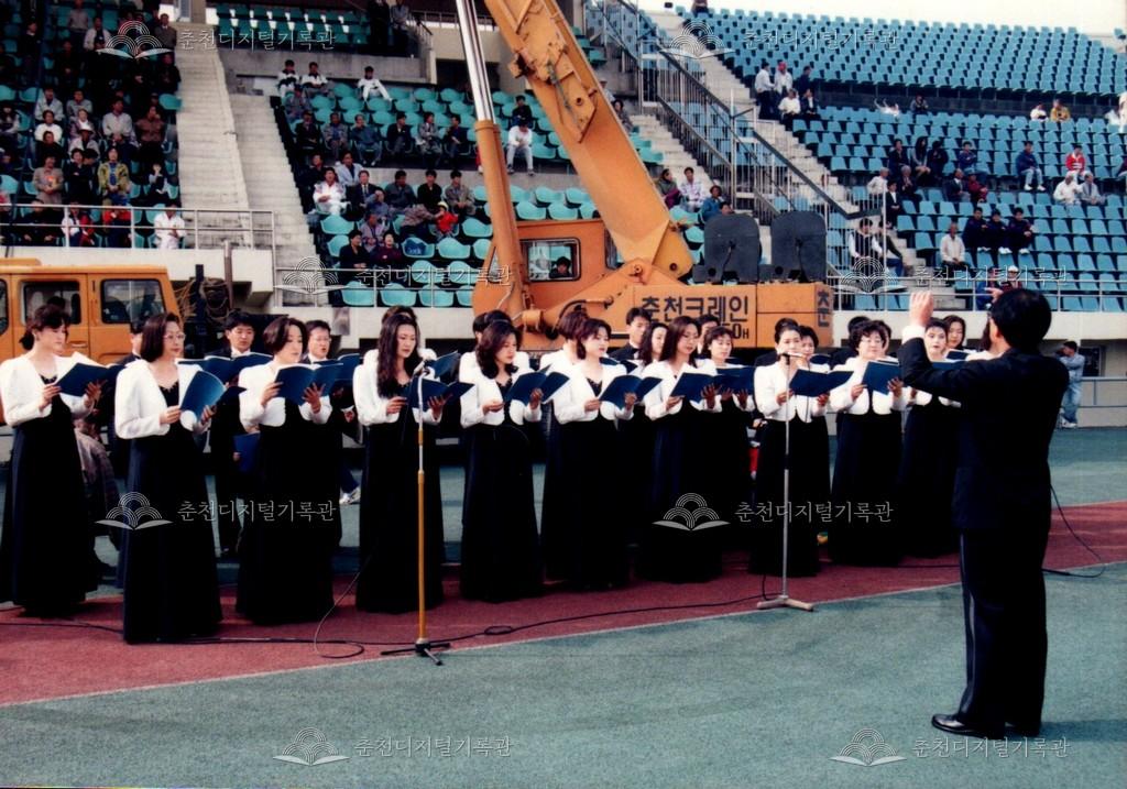 1995년 제18회 소양제(현재 소양강문화제)의 개회식 사진이다. 합창단의 공연 모습이다.