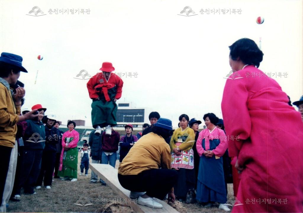 제18회 소양제 민속놀이 사진 등록번호 00002809 생산일자 1995.10 생산지역 춘천시 온의동 생산자 춘천문화원 수집처 춘천문화원 소장자 춘천학연구소 내용 1995년 제18회 소양제(현재 소양강문화제)의 민속놀이 사진이다. 널뛰기를 하는 모습이다. 사용안내 비상업적 이용만 가능|©춘천디지털기록관 상업적 사용·수정·재배포는 저작권자 동의 필요 다운로드 목록보기