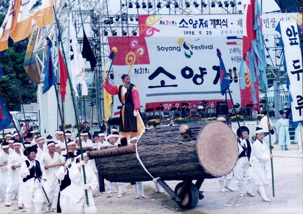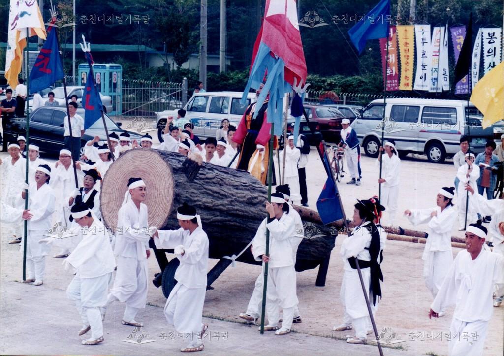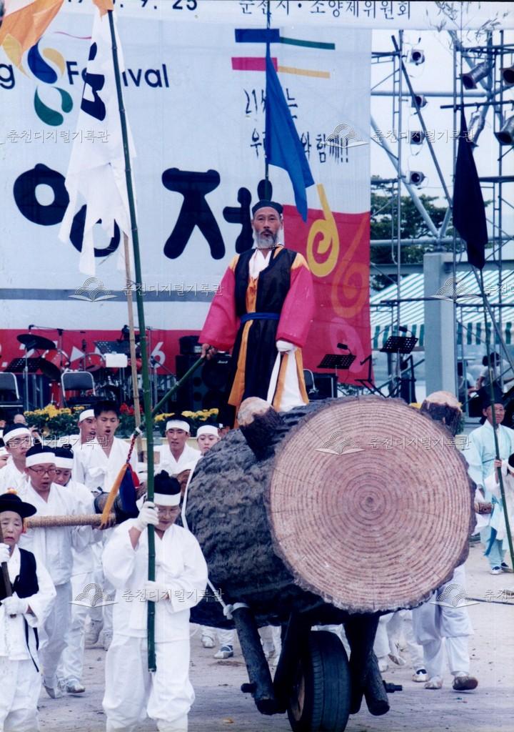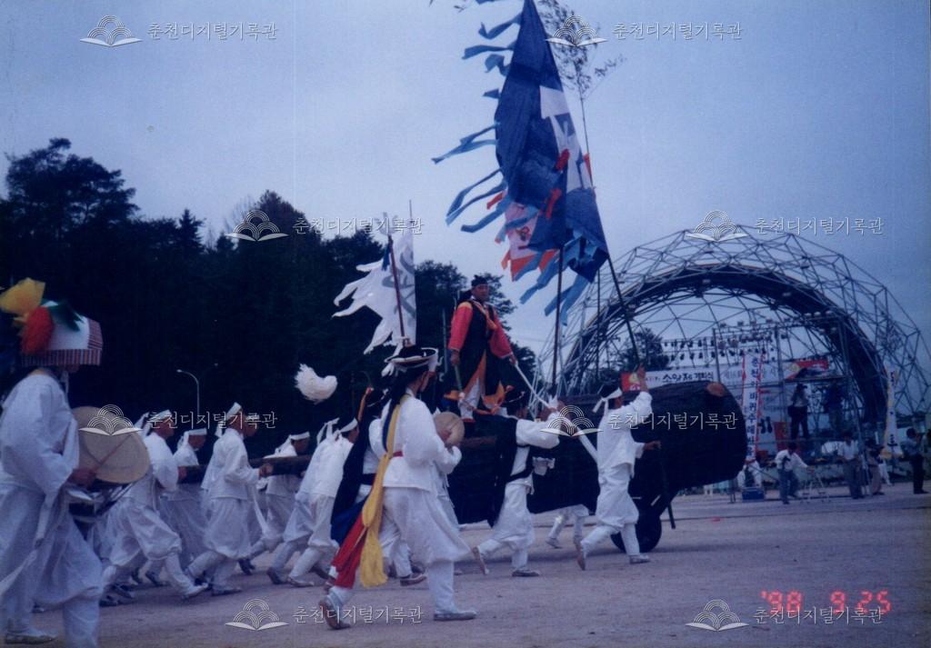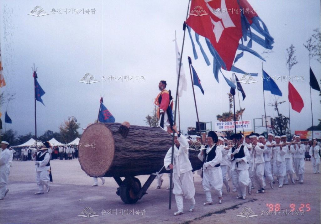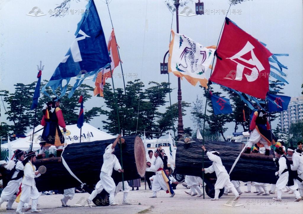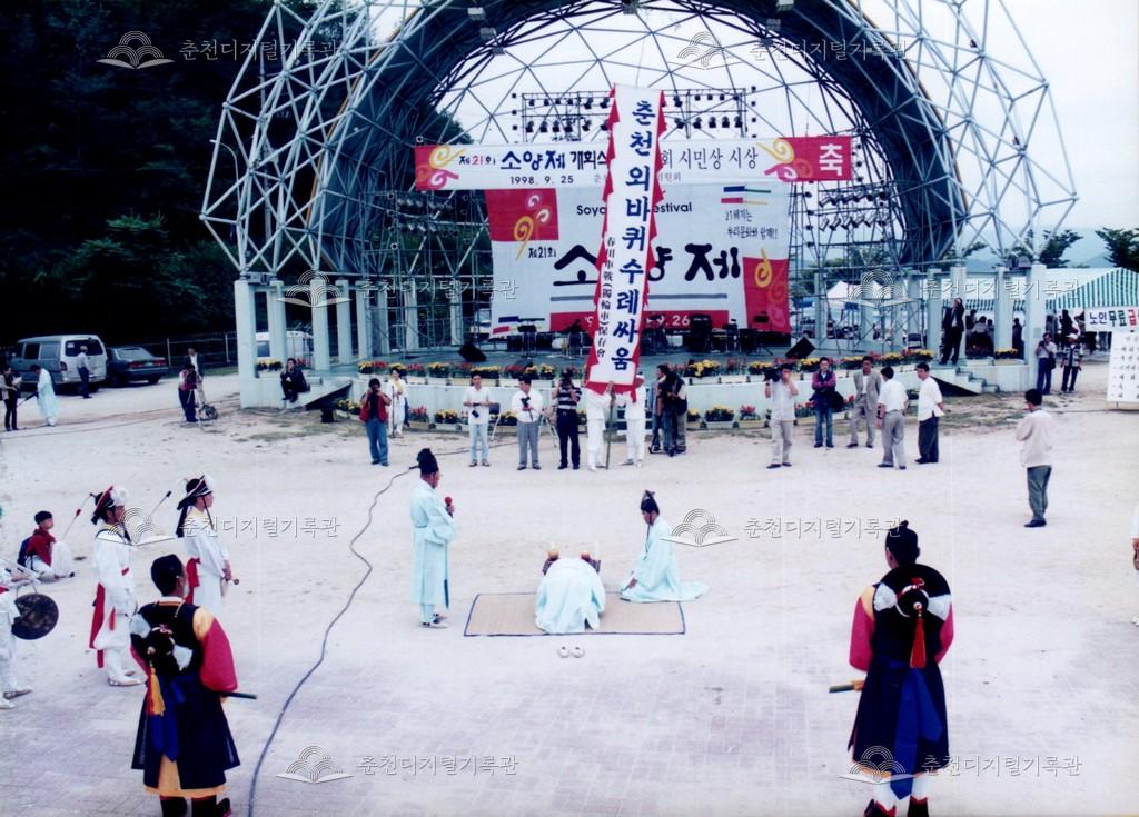 1998년 제21회 소양제(현재 소양강문화제)의 공연 사진이다. 향토민속놀이인 춘천외바퀴수레싸움이 진행되고 있다.