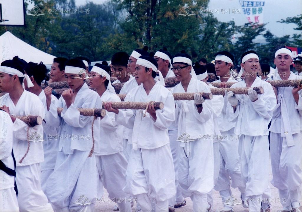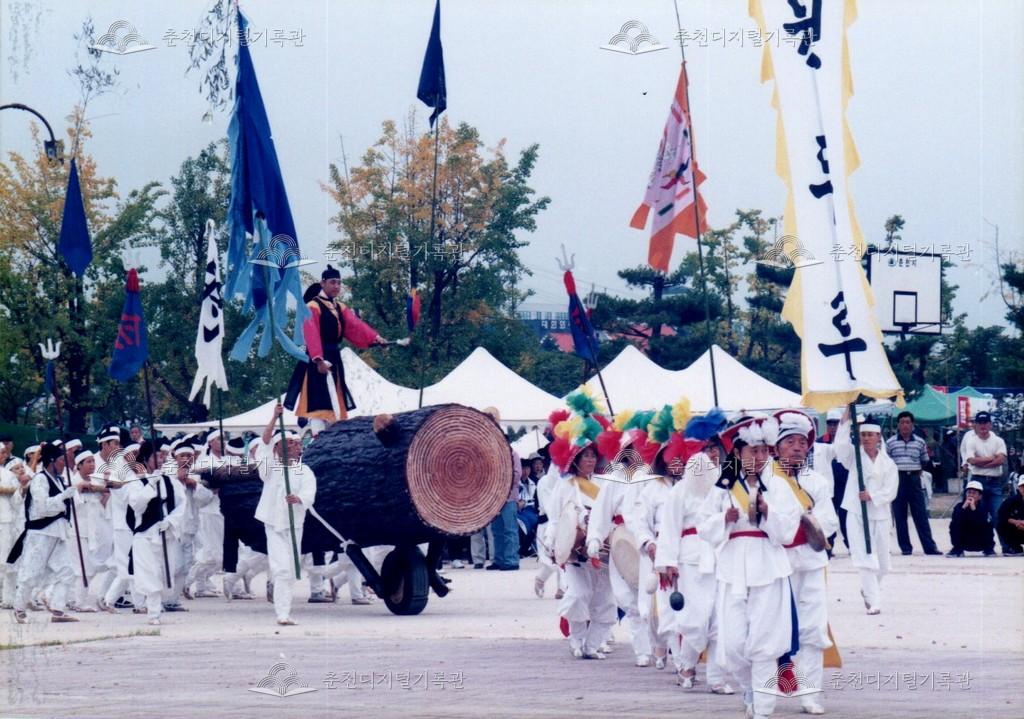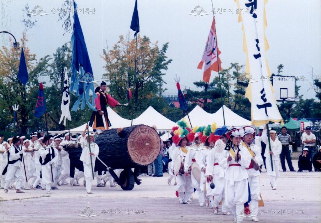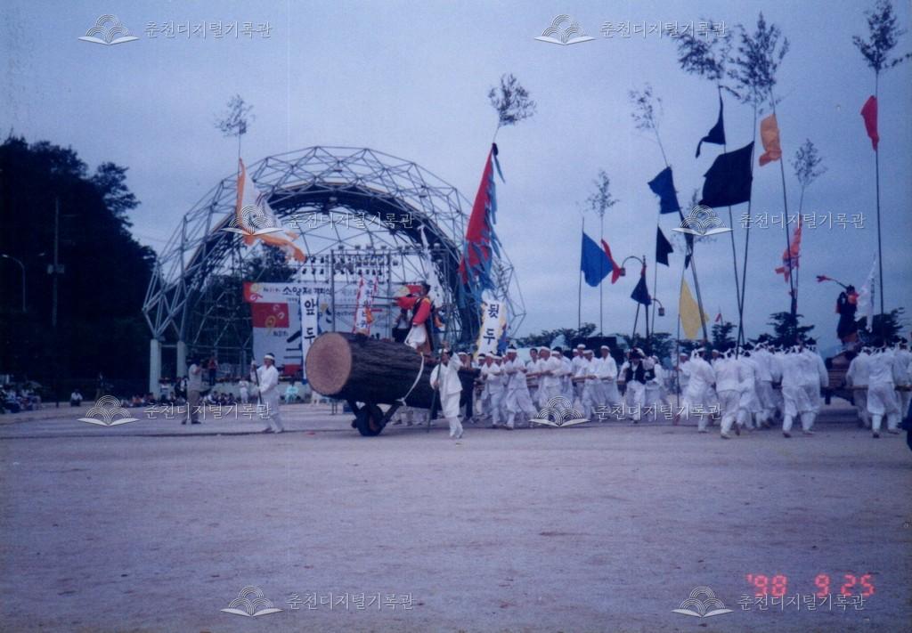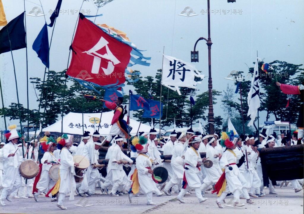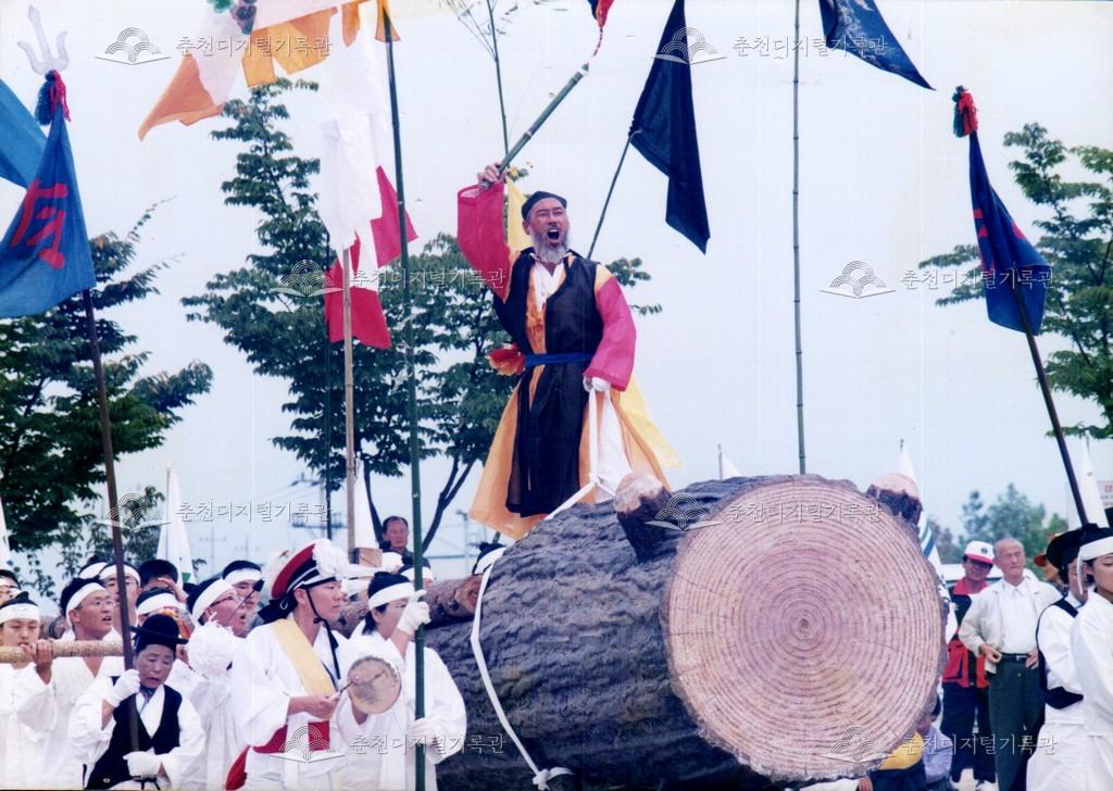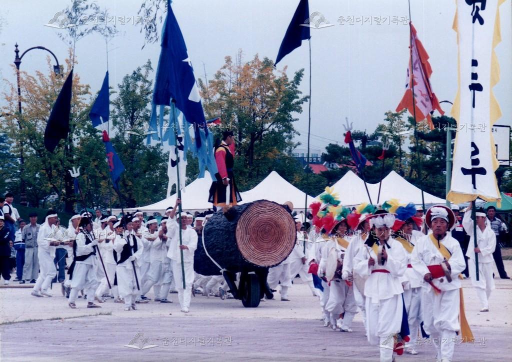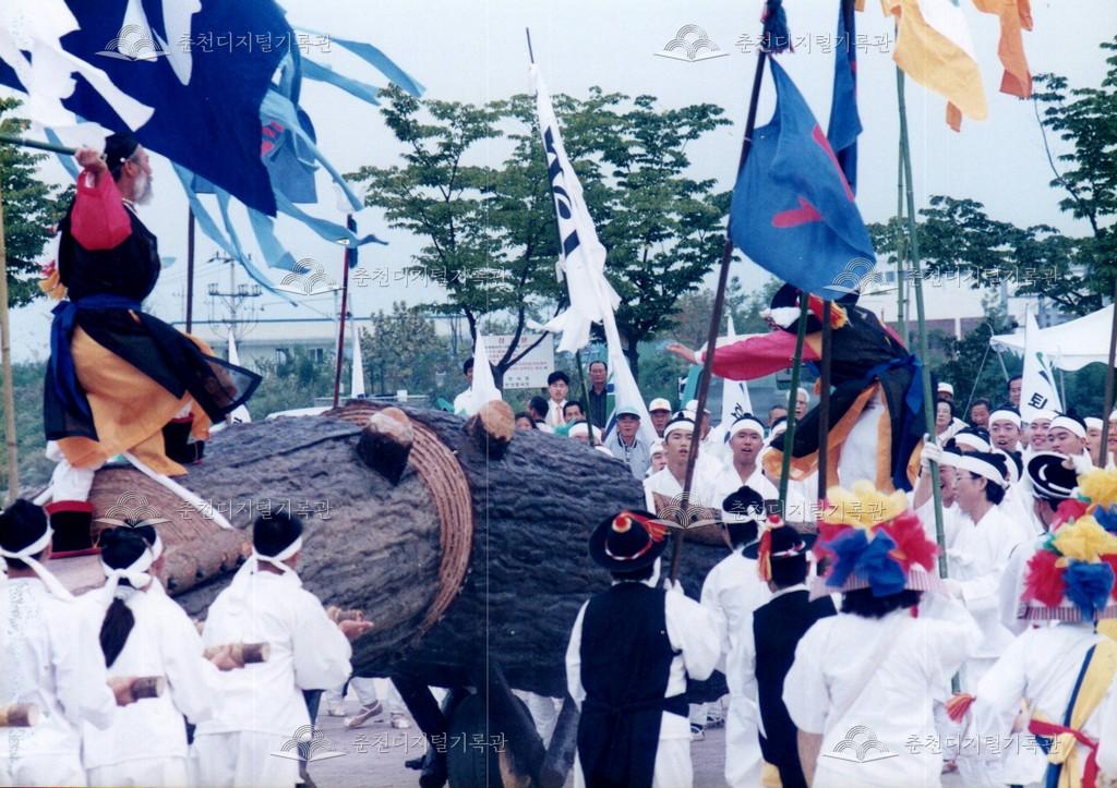 1998년 제21회 소양제(현재 소양강문화제)의 공연 사진이다. 향토민속놀이인 춘천외바퀴수레싸움이 진행되고 있다.