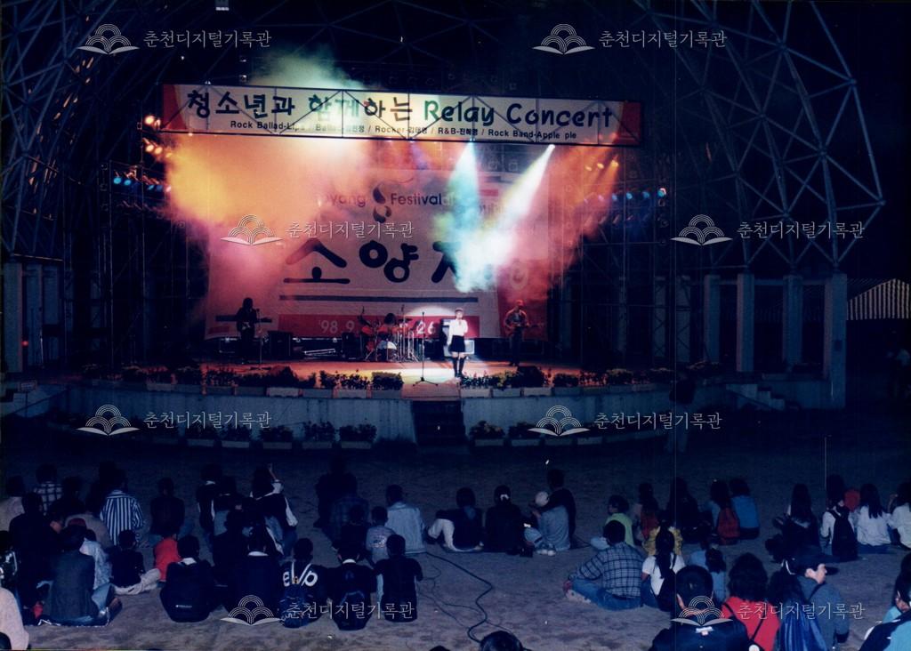 제21회 소양제 청소년과 함께하는 콘서트 사진 등록번호 00002911 생산일자 1998.09.26 생산지역 춘천시 삼천동 생산자 춘천문화원 수집처 춘천문화원 소장자 춘천학연구소 내용 1998년 제21회 소양제(현재 소양강문화제) 중 청소년과 함께하는 Relay Concert 사진이다. 사용안내 비상업적 이용만 가능|©춘천디지털기록관 상업적 사용·수정·재배포는 저작권자 동의 필요 다운로드 목록보기