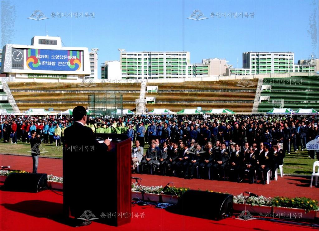 제29회 소양강문화제 개회식 사진 등록번호 00003138 생산일자 2007.10.05 생산지역 춘천시 온의동 생산자 춘천문화원 수집처 춘천문화원 소장자 춘천학연구소 내용 2007년 제29회 소양강문화제의 개회식 사진이다. 개회사를 하는 춘천문화원 이대근 15대 원장의 모습이다. 사용안내 비상업적 이용만 가능|©춘천디지털기록관 상업적 사용·수정·재배포는 저작권자 동의 필요 다운로드 목록보기