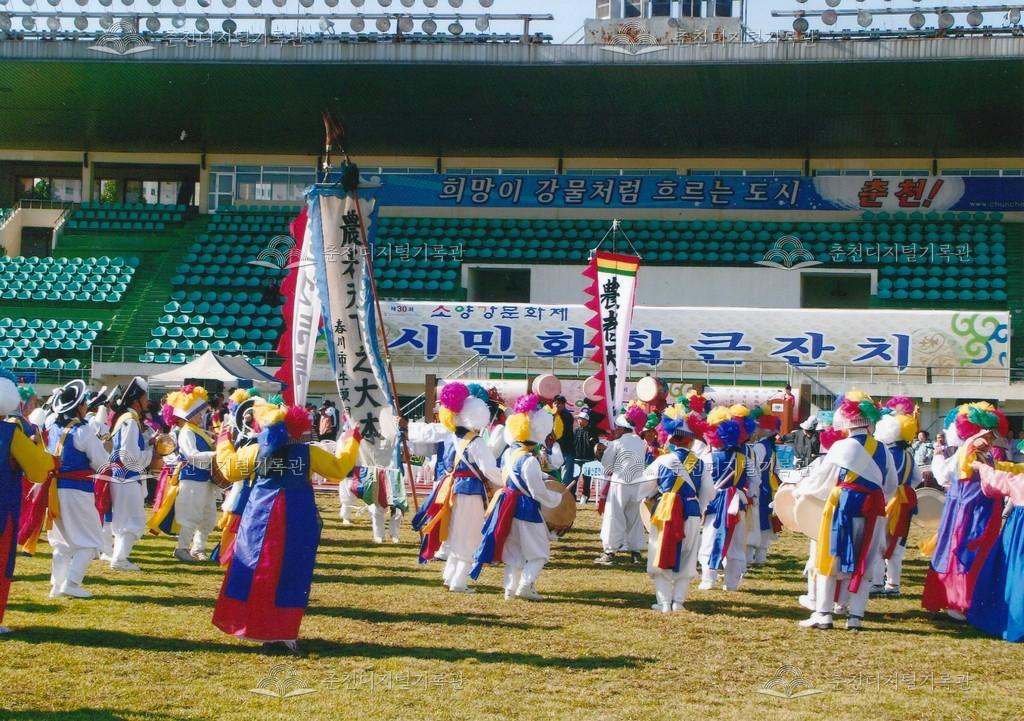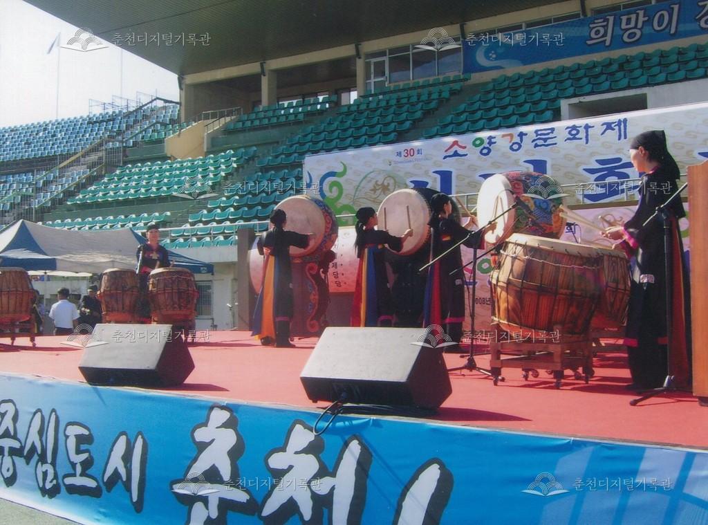 제30회 소양강문화제 개회식 사진 등록번호 00003209 생산일자 2008.09.26 생산지역 춘천시 온의동 생산자 춘천문화원 수집처 춘천문화원 소장자 춘천학연구소 내용 2008년 제30회 소양강문화제의 개회식 사진이다. 개회 공연으로 풍물놀이과 오고무 공연이 진행되었다. 사용안내 비상업적 이용만 가능|©춘천디지털기록관 상업적 사용·수정·재배포는 저작권자 동의 필요 다운로드 목록보기