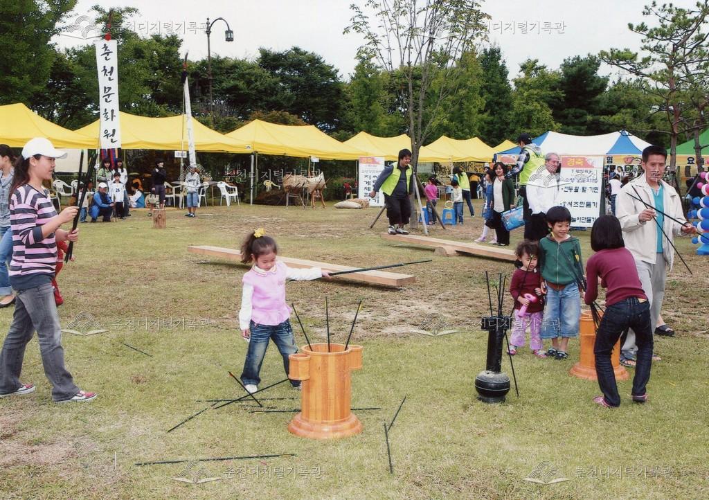 2008년 제30회 소양강문화제의 체험장 사진이다. 투호 던지기를 하는 모습이다.