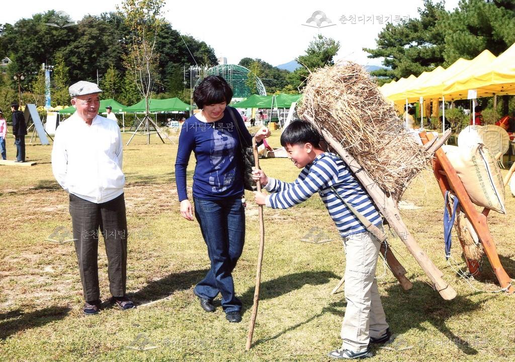 2008년 제30회 소양강문화제의 체험장 사진이다. 지게 체험을 하는 모습이다. 싸리비 만들기 체험장의 안내판이 함꼐 보인다.