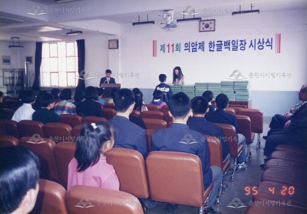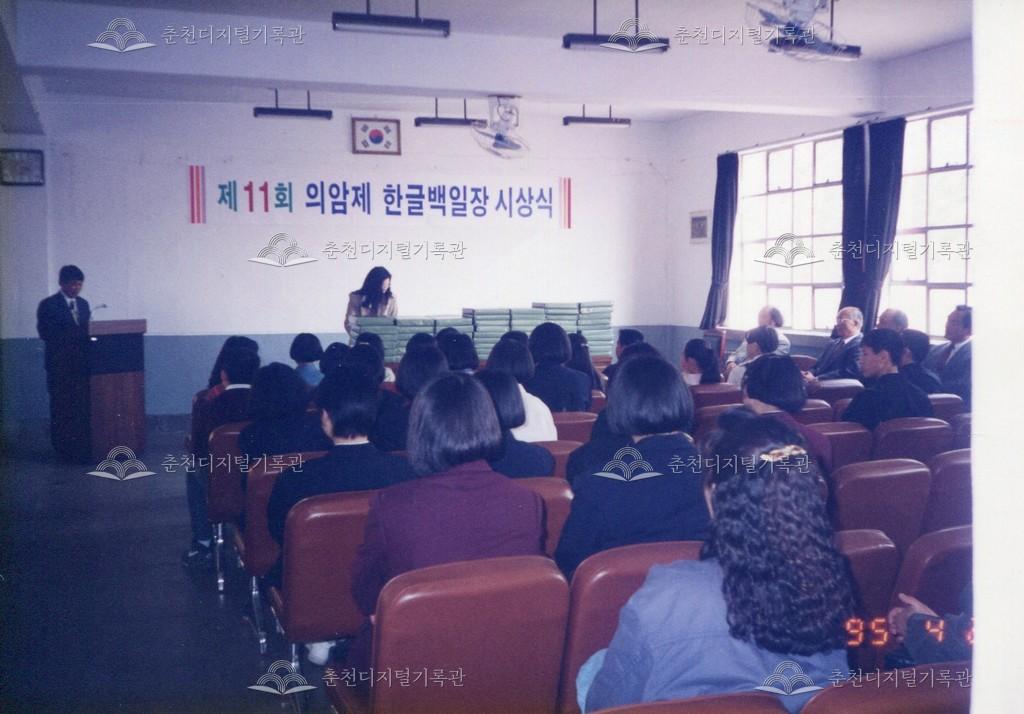 제11회 의암제 한글백일장 시상식 사진 등록번호 00003334 생산일자 1995.04 생산지역 춘천시 봉의동 생산자 춘천문화원 수집처 춘천문화원 소장자 춘천학연구소 내용 1995년 제11회 의암제의 한글백일장 시상식 사진이다. 춘천문화원 봉의동 원사에서 진행되었다. 사용안내 비상업적 이용만 가능|©춘천디지털기록관 상업적 사용·수정·재배포는 저작권자 동의 필요 다운로드 목록보기