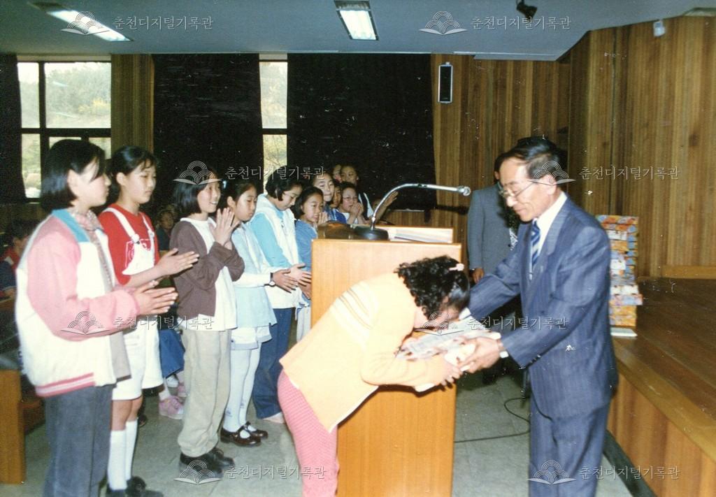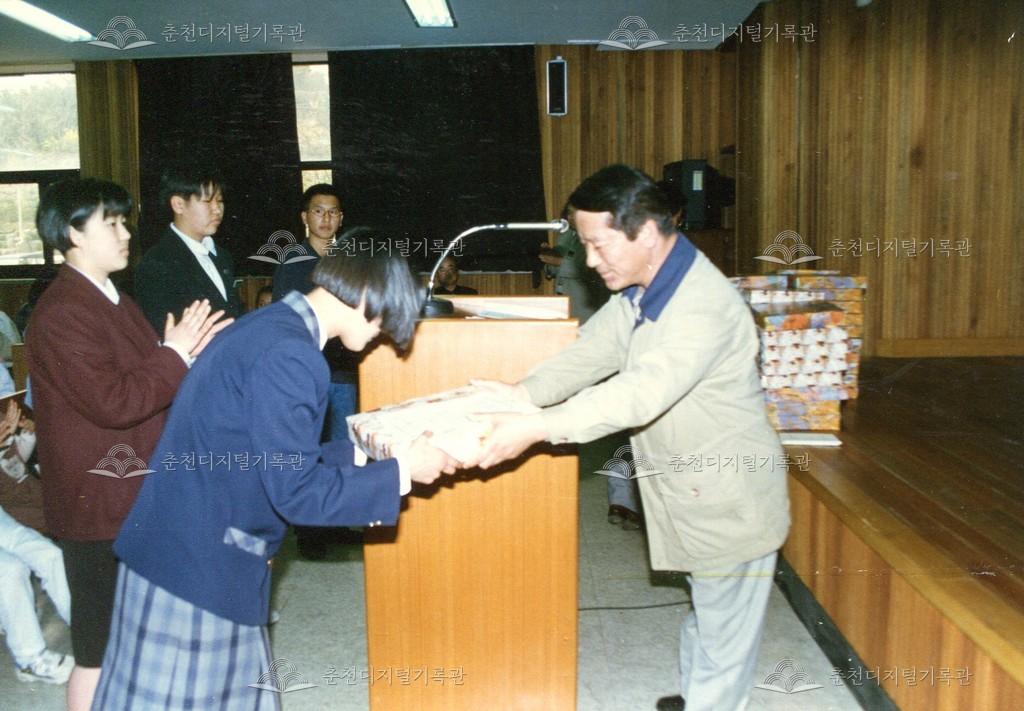제12회 의암제 한글백일장 시상식 사진 등록번호 00003348 생산일자 1996.04.27 생산지역 춘천시 생산자 춘천문화원 수집처 춘천문화원 소장자 춘천학연구소 내용 1996년 제12회 의암제 중 진행된 한글백일장의 시상식 사진이다. 사용안내 비상업적 이용만 가능|©춘천디지털기록관 상업적 사용·수정·재배포는 저작권자 동의 필요 다운로드 목록보기
