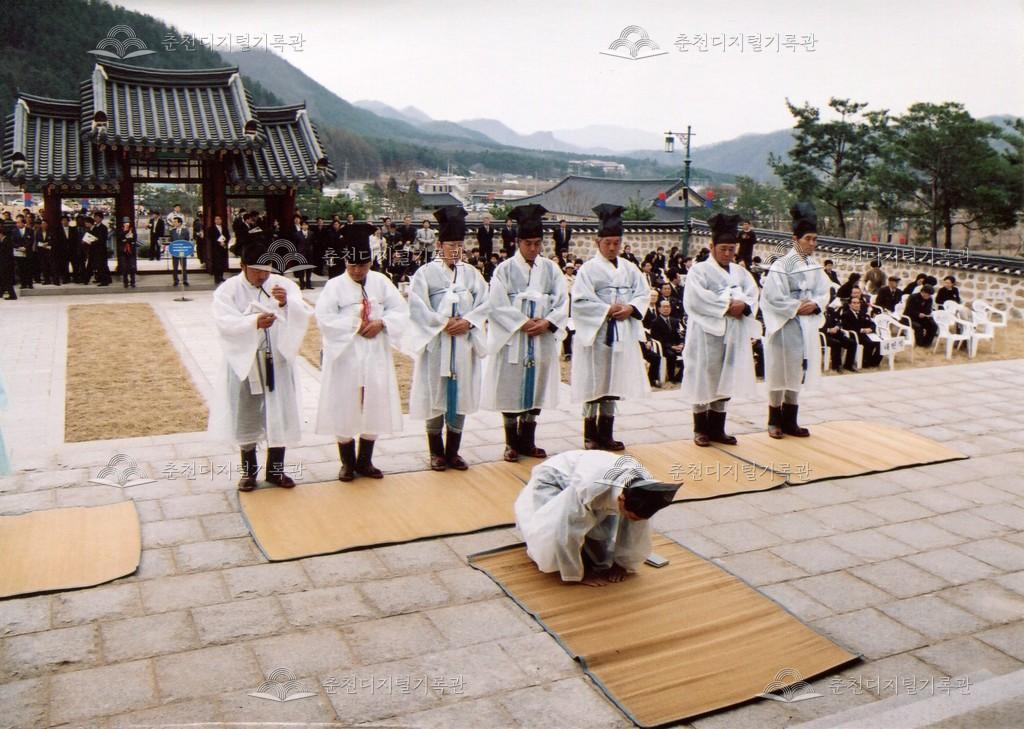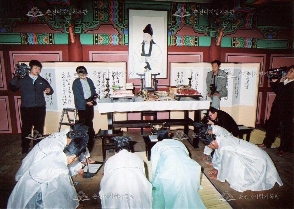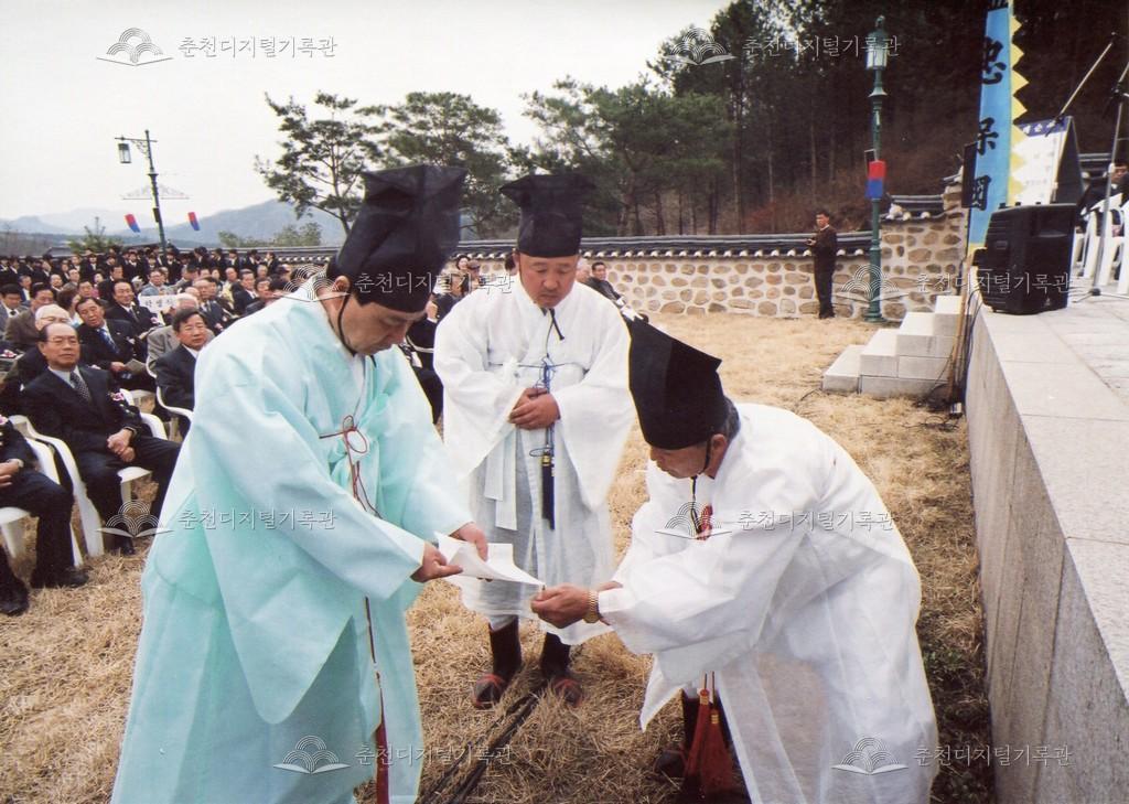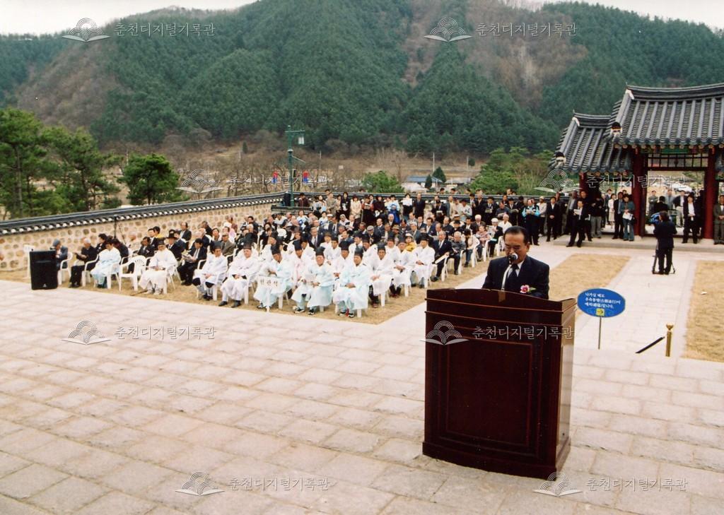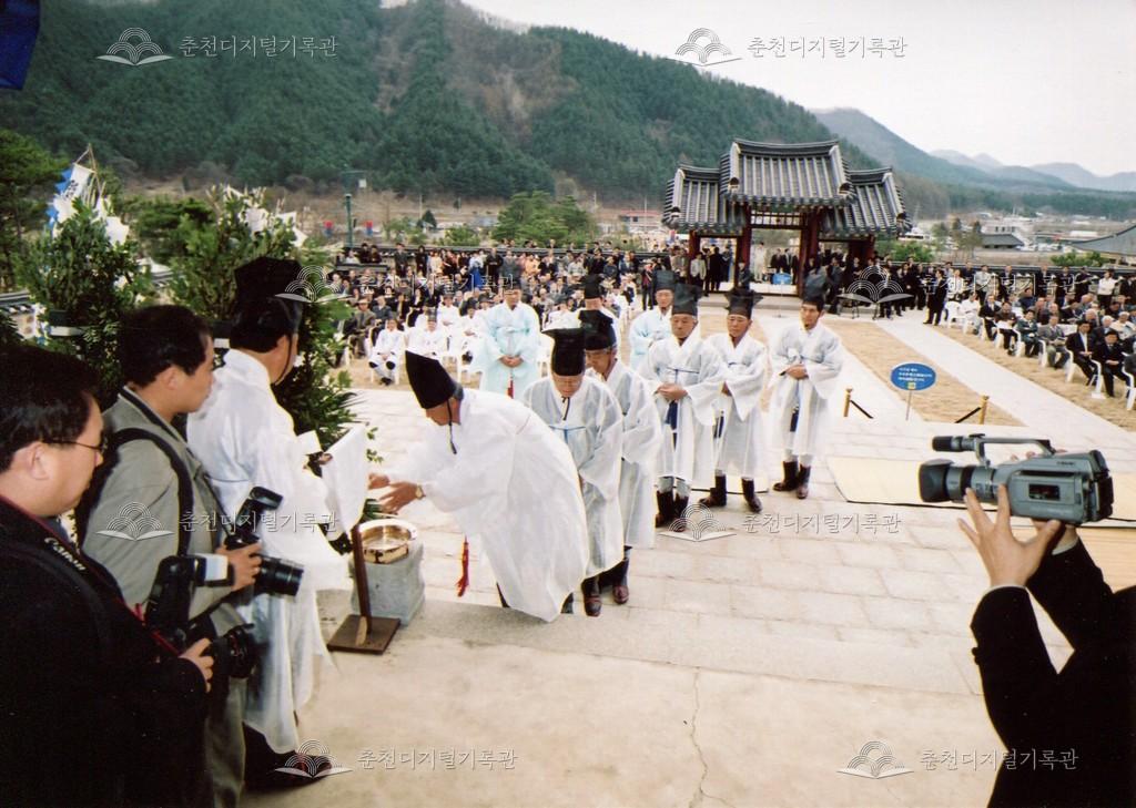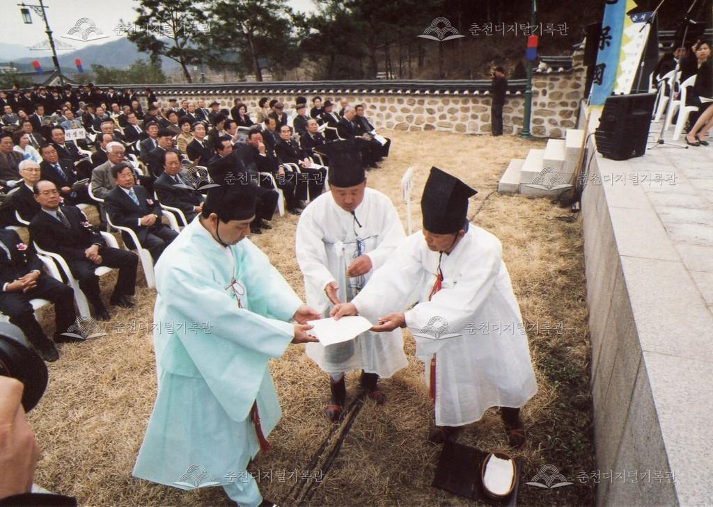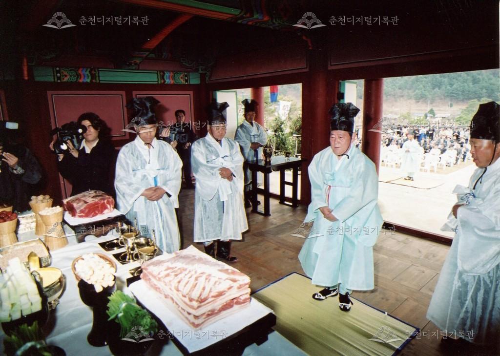 2005년 제21회 의암류인석선생제(의암제)의 사진이다. 2004년 5월 남면 가정리에 의암류인석기념관이 개관되어 2005년부터 기념관에서 의암제가 진행되었다. 관동의병대장기, 초상화 등의 모습이 보인다.