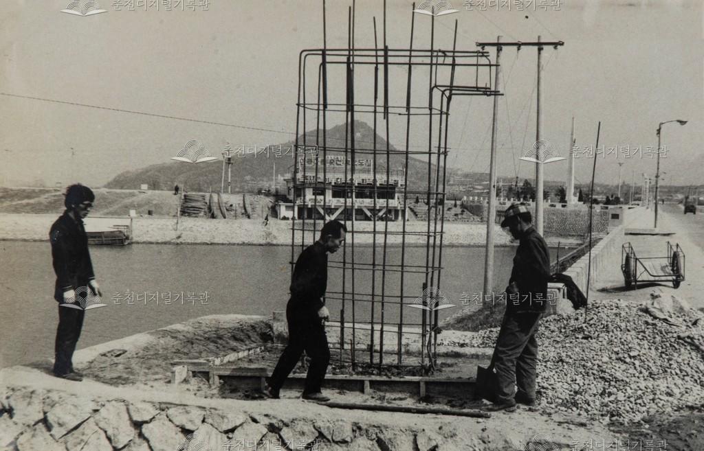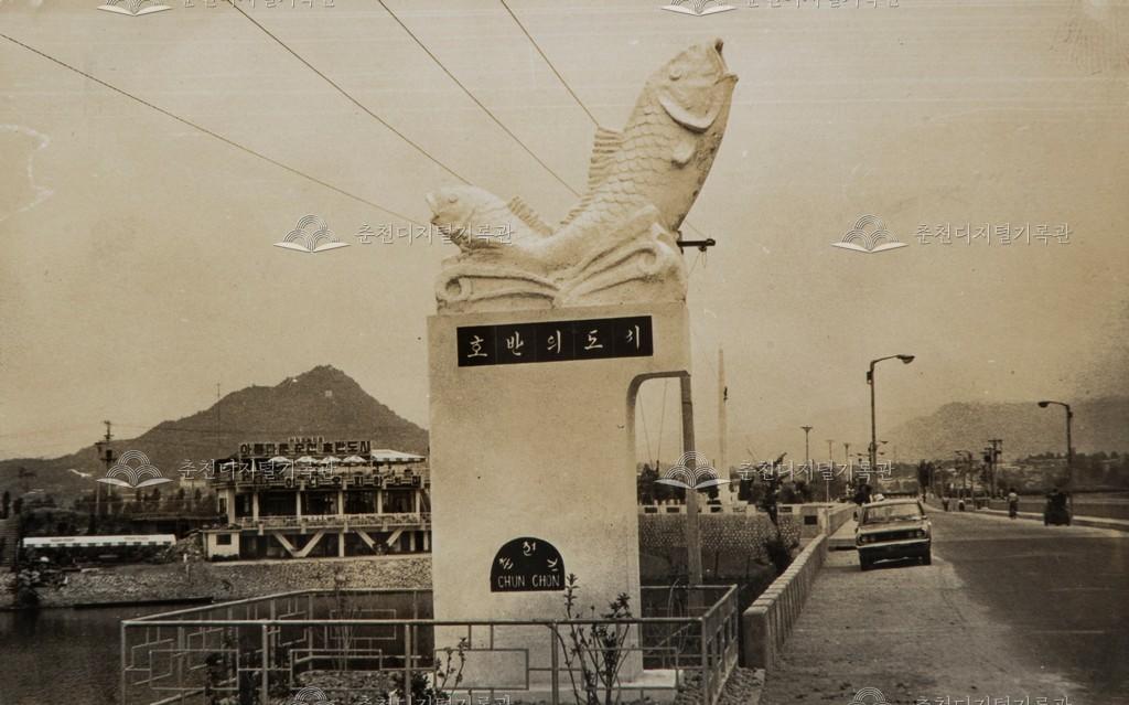 공치천에 있던 잉어상의 건설과 완공 사진이다. 호반의 도시라는 문구가 적혀있다. 1968년부터 영업을 시작한 카페 이디오피아의 집이 잉어상 뒤로 보여, 시기는 1968년 이후로 추정된다.