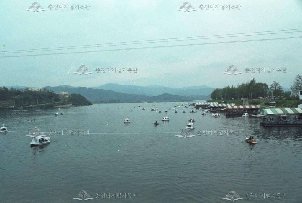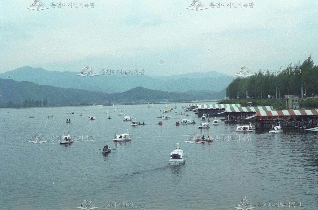 1987년 개최된 제5회 소양제 전경이다. 공지천에서 오리배를 타는 사람들 모습이다.