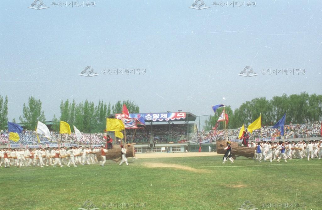 제5회 소양제 공개행사의 일환으로 진행된 외바퀴 수레싸움 시범 장면이다. 강원고등학교 학생들이 참여하였다.
