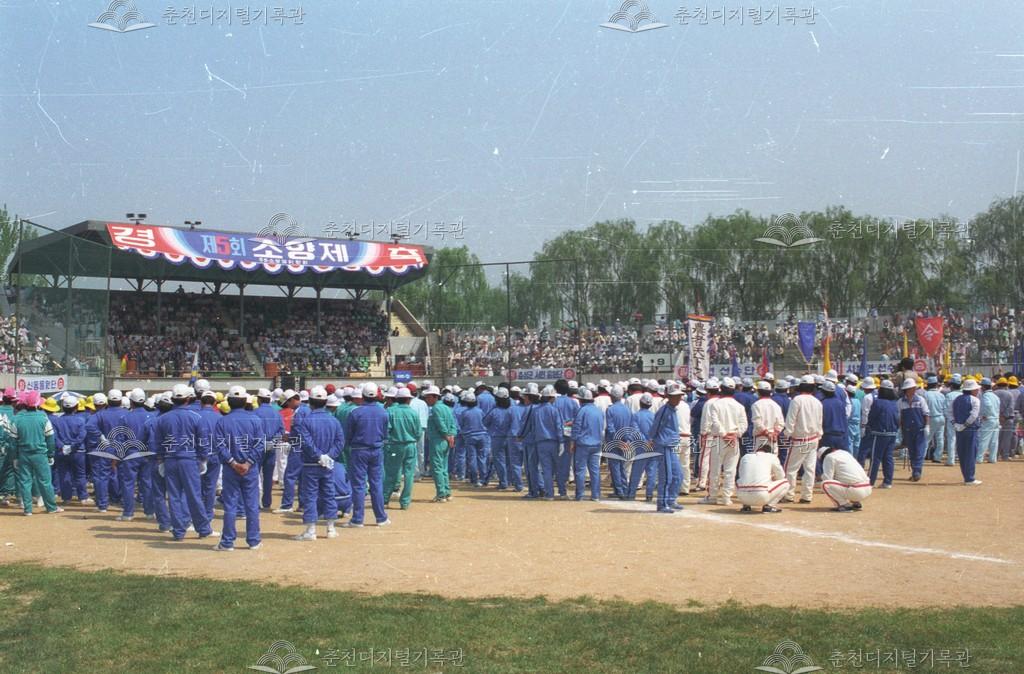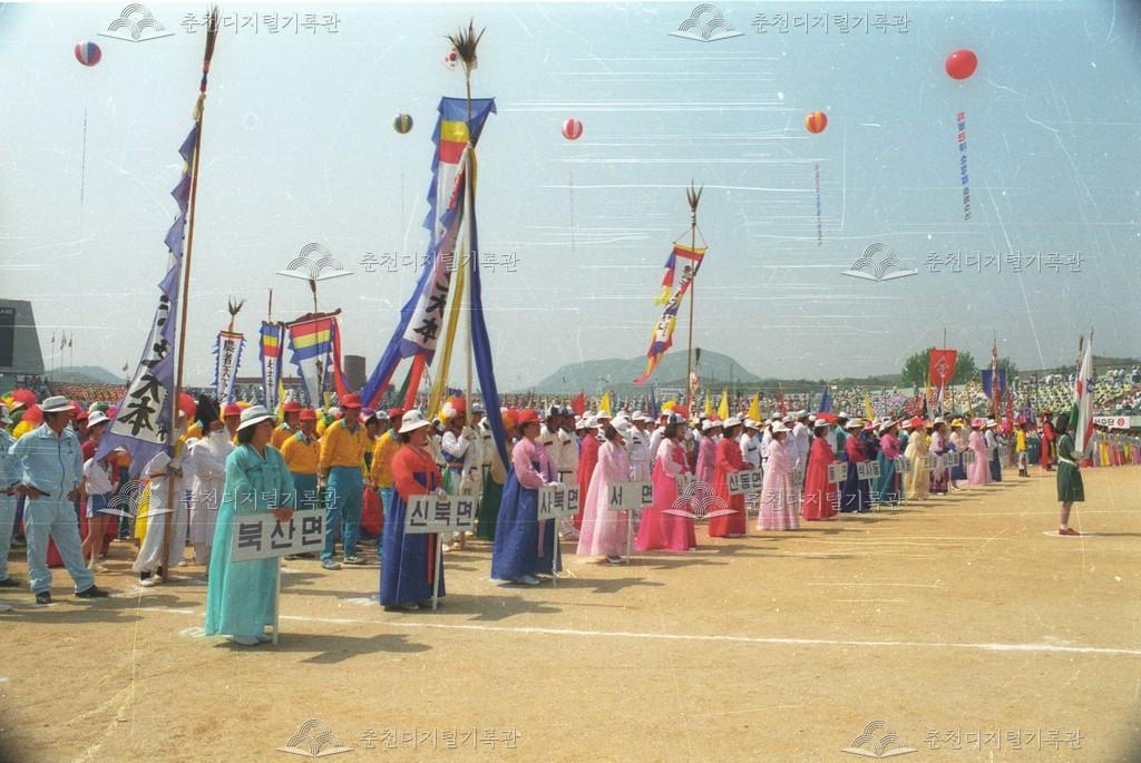 제5회 소양제 민속경연대회 개회식 장면이다. 민속경연대회에 참가하기 위한 각 읍면별 선수단의 모습을 볼 수 있다.