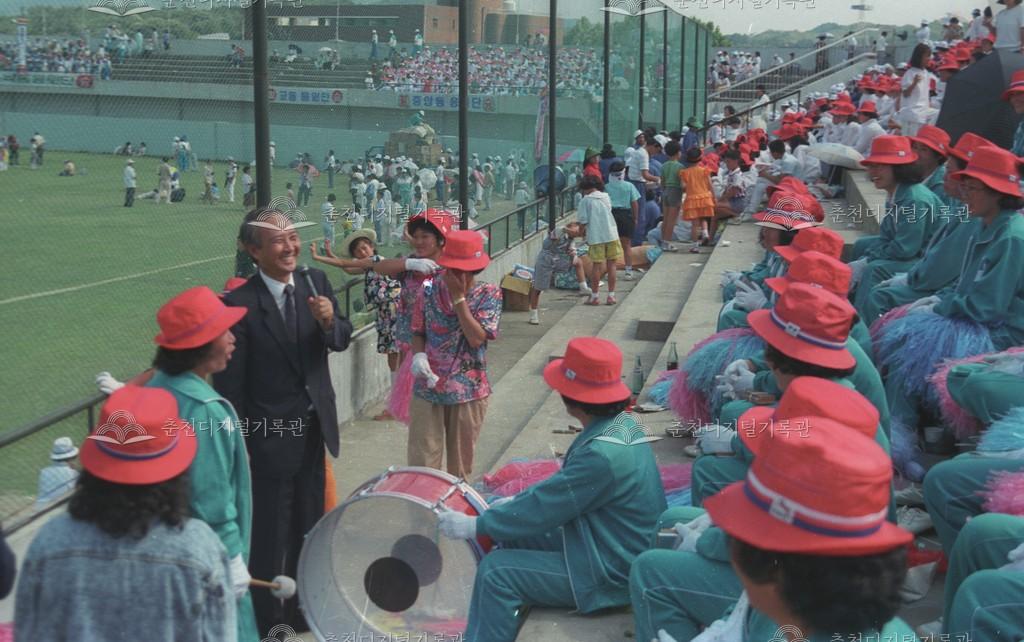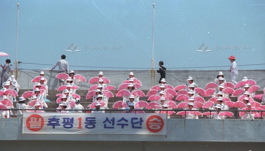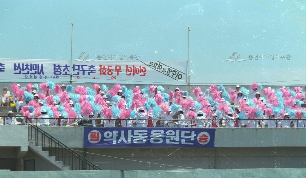제7회 소양제 민속경연에 참가한 선수들을 응원하기 위해 각 읍면별 주민들이 응원전을 펼치고 있다.