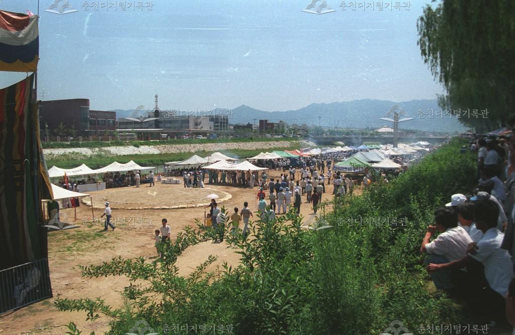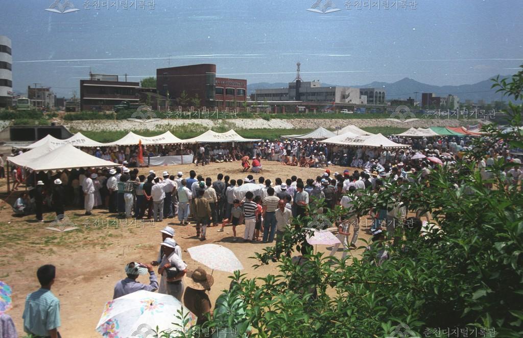 제7회 소양제_씨름대회 등록번호 00003759 생산일자 1989.06.11 생산지역 춘천종합경기장 야구장 고수부지 생산자 춘천시청 수집처 춘천시청 소장자 춘천시청 내용 제7회 소양제 씨름대회 모습이다. 사용안내 비상업적 이용만 가능|©춘천디지털기록관 상업적 사용·수정·재배포는 저작권자 동의 필요 다운로드 목록보기
