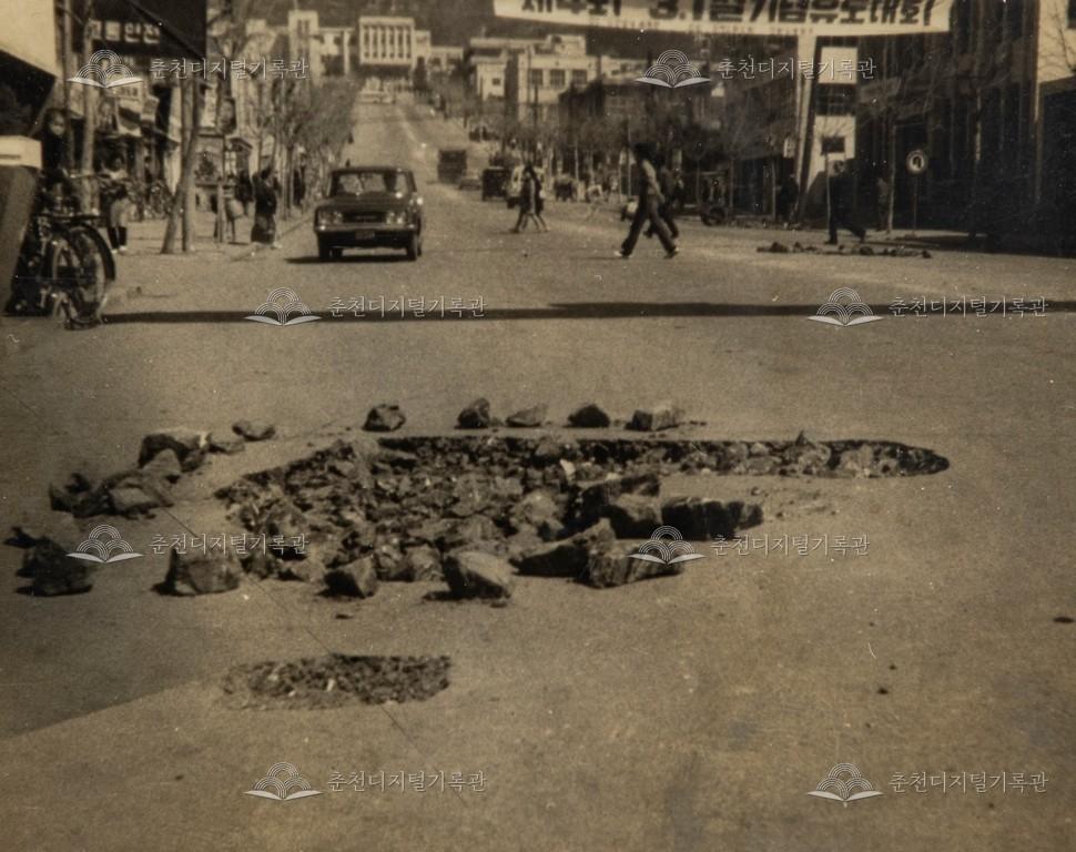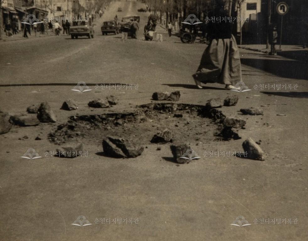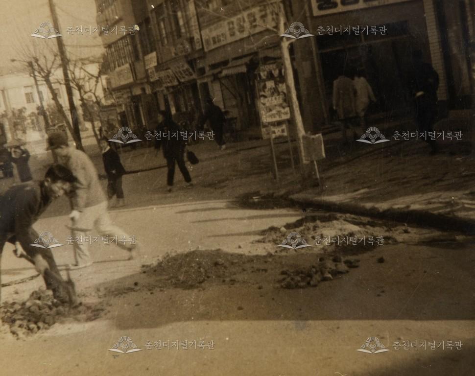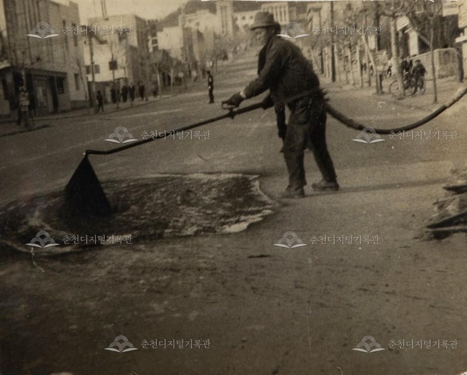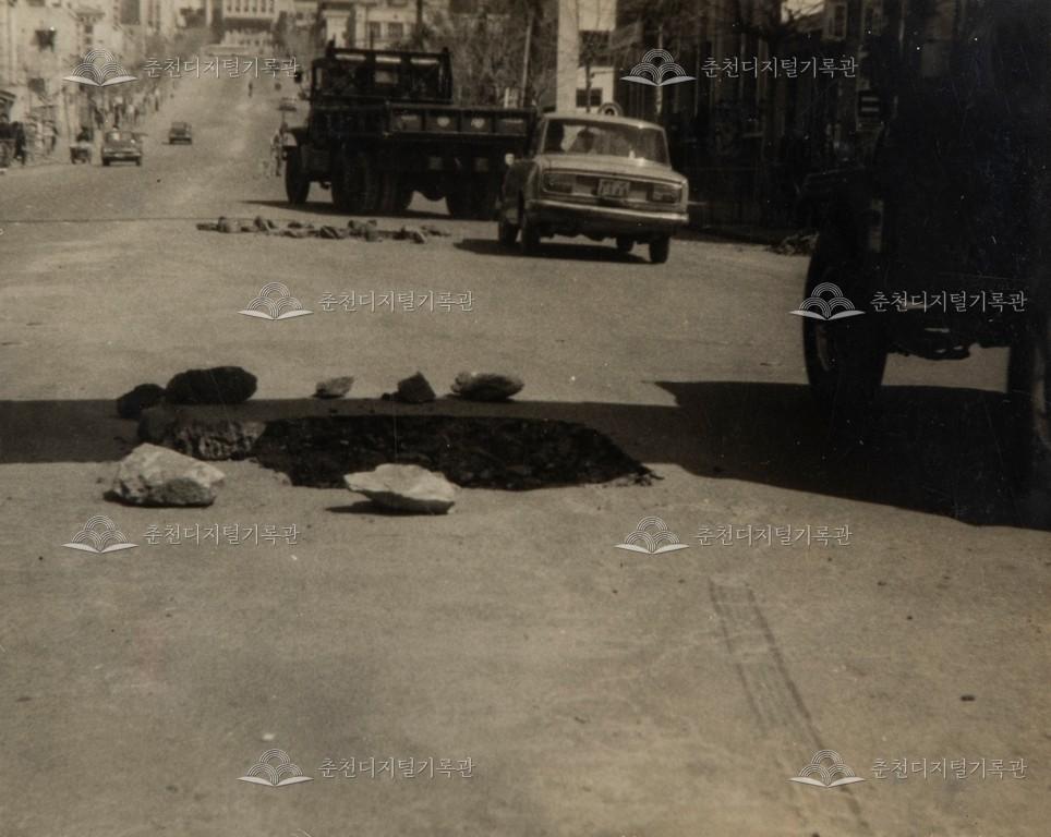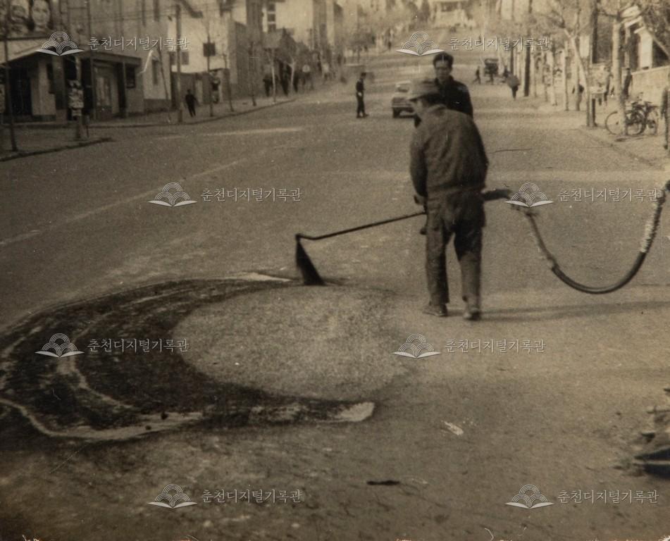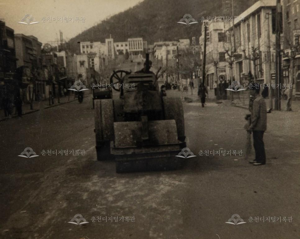 1967년 중앙로 로터리에서 강원도청 방향 도로 보수를 하고 포장을 하는 현장을 촬영한 것이다. 중앙문구사 간판(두번째 사진), 피아트 자가용과 제무시(GMC) 트럭(세번재 사진)이 달리고 있다.
