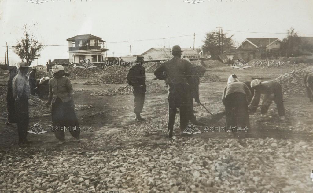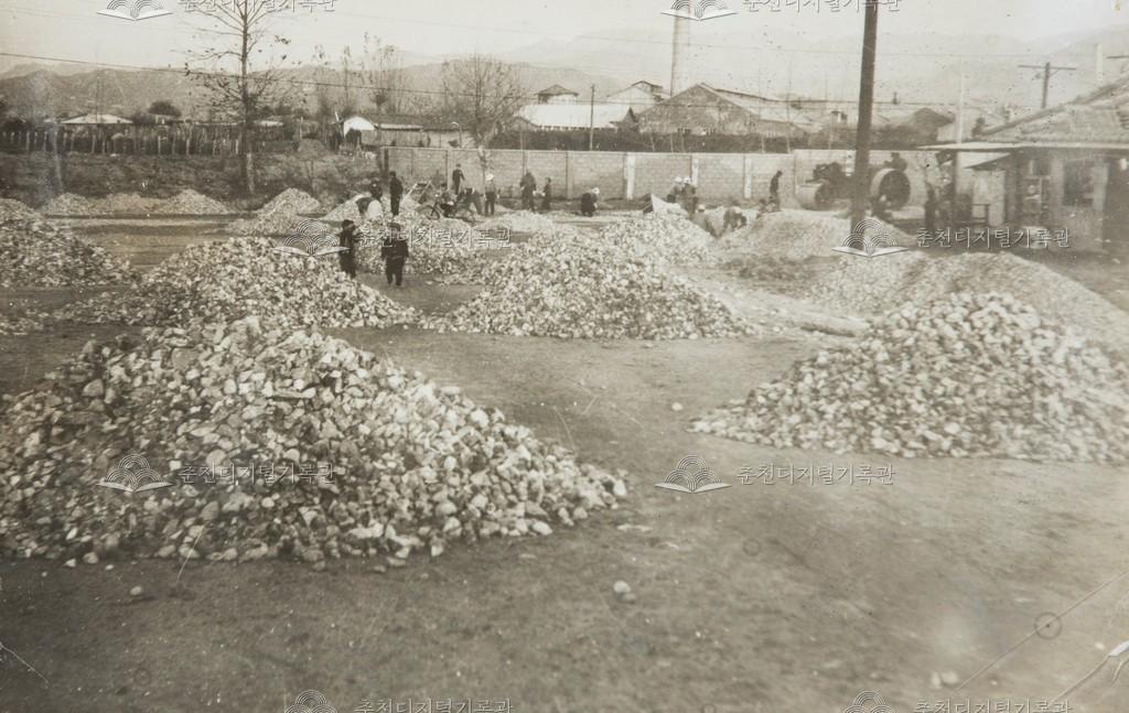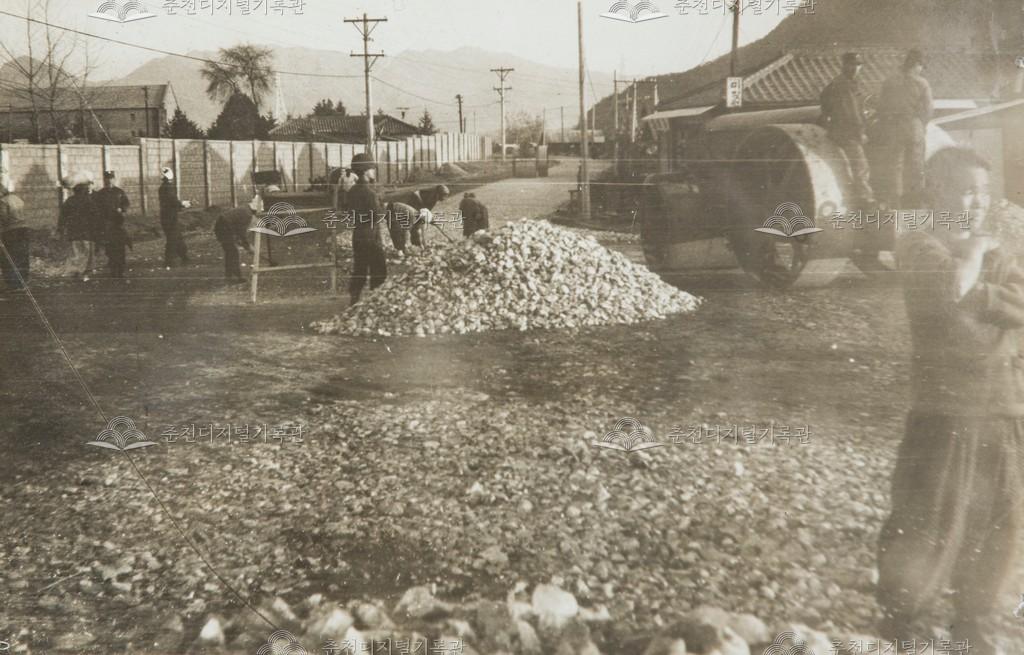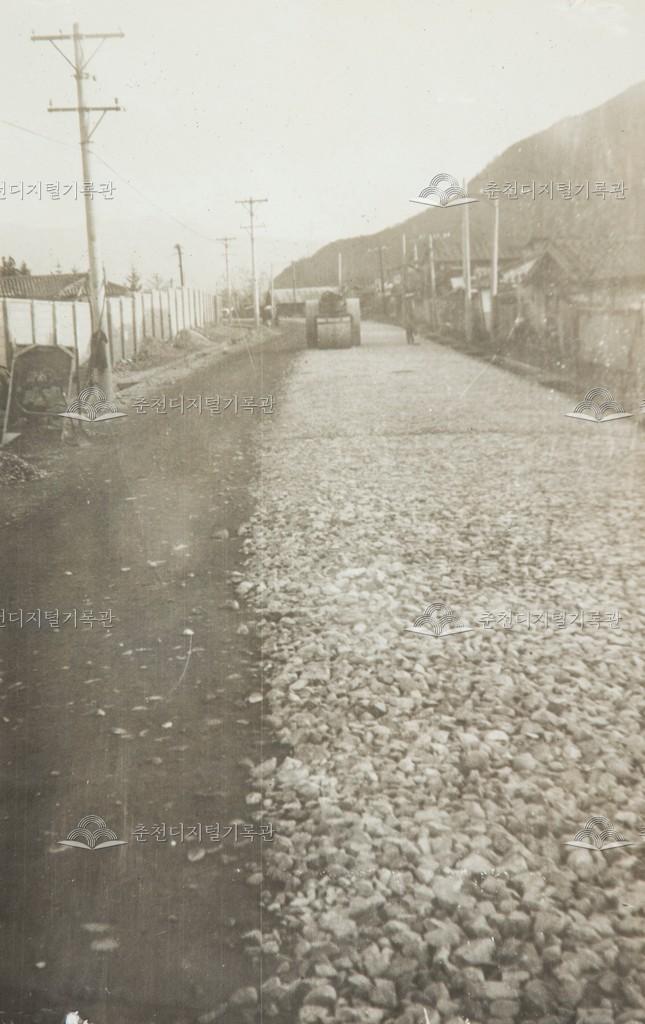 1969년 시가지 이면도로 포장 광경이다. 부순 돌을 뿌리고 다져서 맞물려 단단하게 결합하도록 하는 머캐덤(마카담) 공법으로 시공 중이다. 소양로 번개시장 주변으로 추정된다.
