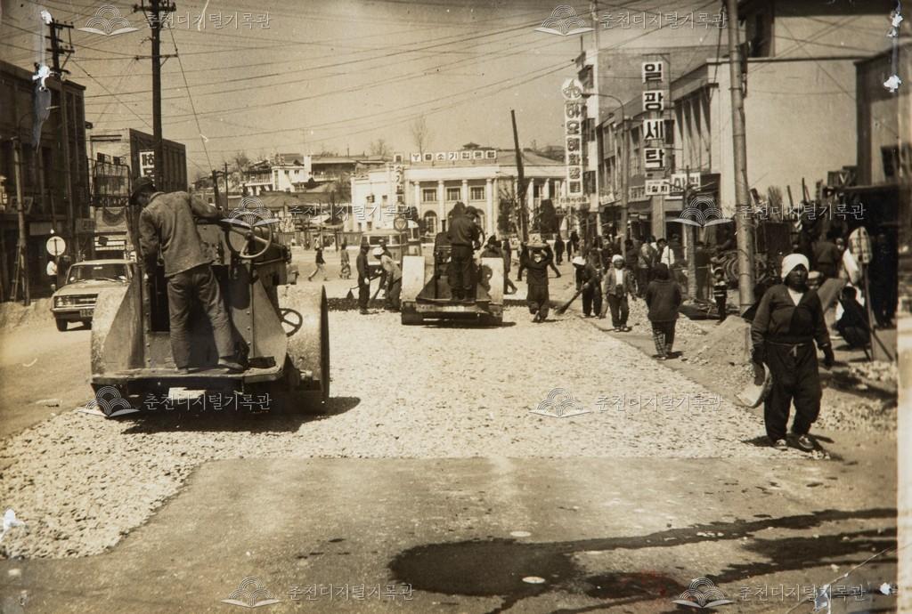 1969년 조양동 명동 입구 도로 포장 공사 중으로 롤러로 쇄석 다짐 중이다. 옛 중소기업은행 건물, 아모레 화장품, 일광세탁 간판이 보인다.