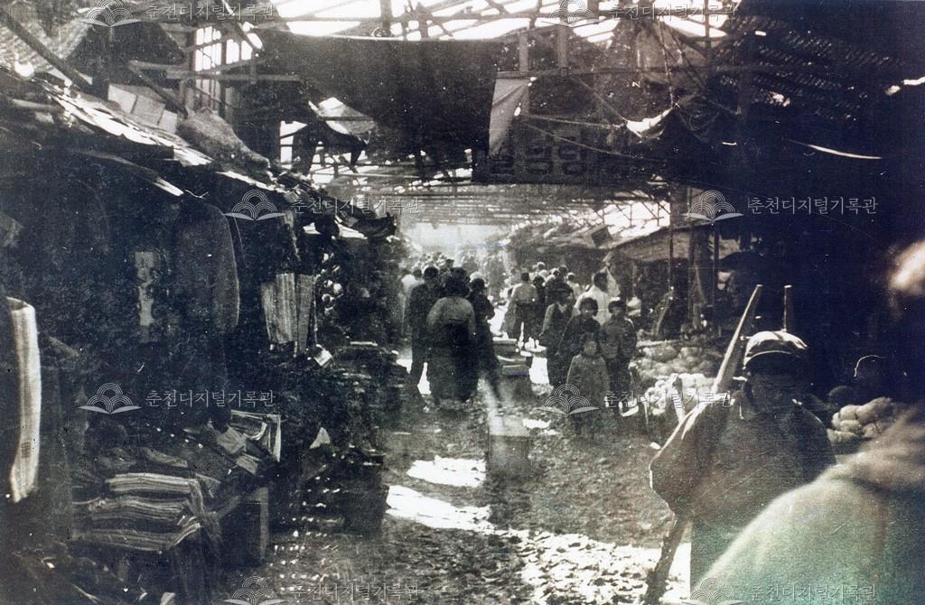 예전 서부시장의 내부모습처럼 보이나 정확한 위치는 알 수 없다. 그래도 당시 정착화되어 상행위가 이루어지던 시장풍경이다. <춘천시문화재단 토마스누조 기증 사진전 "한국전쟁 직후 춘천의 일상" >