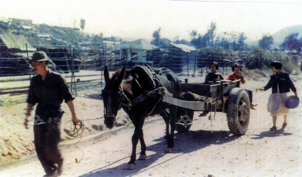 나귀가 끄는 마차에 타고 신나하는 소녀들의 해맑은 웃음소리가 들려오는듯하다. 무표정하게 고삐를 잡고 가는 마부와 묘한 대조를 이룬다. <춘천시문화재단 토마스누조 기증 사진전 "한국전쟁 직후 춘천의 일상" >