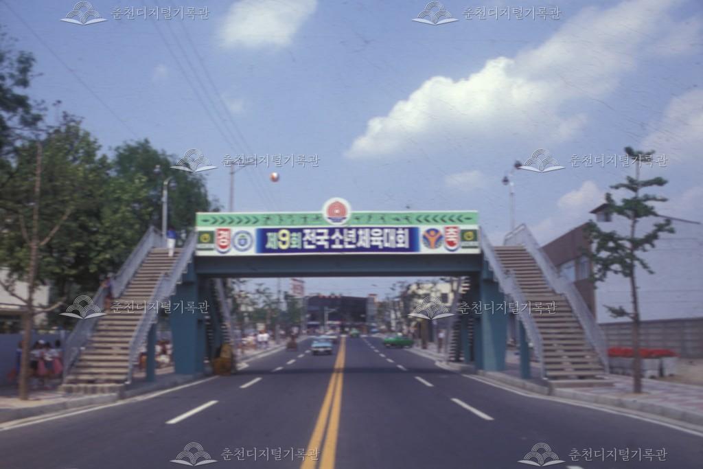 봉의초등학교 앞 육교의 모습으로, 제9회 전국소년체육대회 홍보 현수막이 게첨되어 있다.