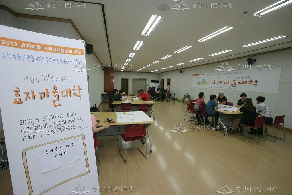 효자동 효자마을대학 등록번호 00004314 생산일자 2013 생산지역 춘천 효자동 생산자 춘천시청 수집처 춘천시청 소장자 춘천시청 내용 2013 효자마을 커뮤니티활성화 사업 - 주민이 직접 만들어가는 효자마을대학 사용안내 비상업적 이용만 가능|©춘천디지털기록관 상업적 사용·수정·재배포는 저작권자 동의 필요 다운로드 목록보기