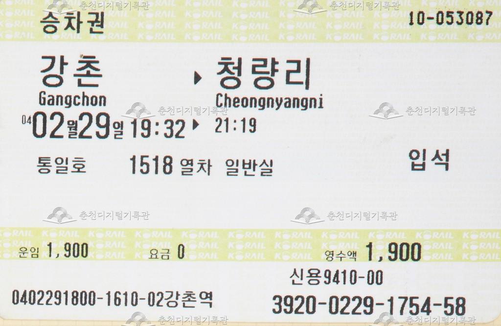 통일호 승차권 : 강촌-청량리 입석 등록번호 00005109 생산일자 2004.02.29 생산지역 춘천시 생산자 한국철도공사 수집처 최윤석 소장자 최윤석 내용 MS 승차권이라고도 불리는 자성승차권이다. 열차 등급은 통일호로 강촌-청량리 입석 승차권이다. 다수의 조그만 'KORAIL'의 로고가 보인다. 자세히 보기 닫기 사용안내 비상업적 이용만 가능|©춘천디지털기록관 상업적 사용·수정·재배포는 저작권자 동의 필요 다운로드 목록보기