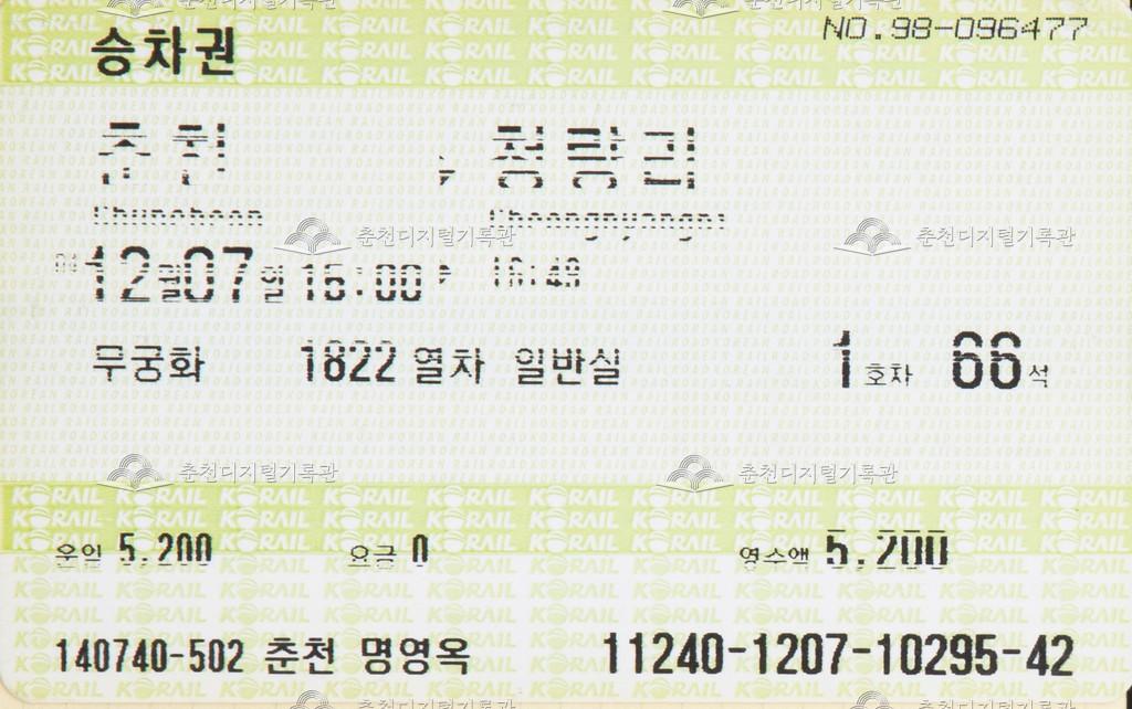 무궁화호 승차권 : 춘천-청량리 등록번호 00005144 생산일자 2004.12.07 생산지역 춘천시 생산자 한국철도공사 수집처 최윤석 소장자 최윤석 내용 MS 승차권이라고도 불리는 자성승차권이다. 열차 등급은 무궁화호로 춘천-청량리 승차권이다. 다수의 조그만 'KORAIL'의 로고가 보인다. 자세히 보기 닫기 사용안내 비상업적 이용만 가능|©춘천디지털기록관 상업적 사용·수정·재배포는 저작권자 동의 필요 다운로드 목록보기