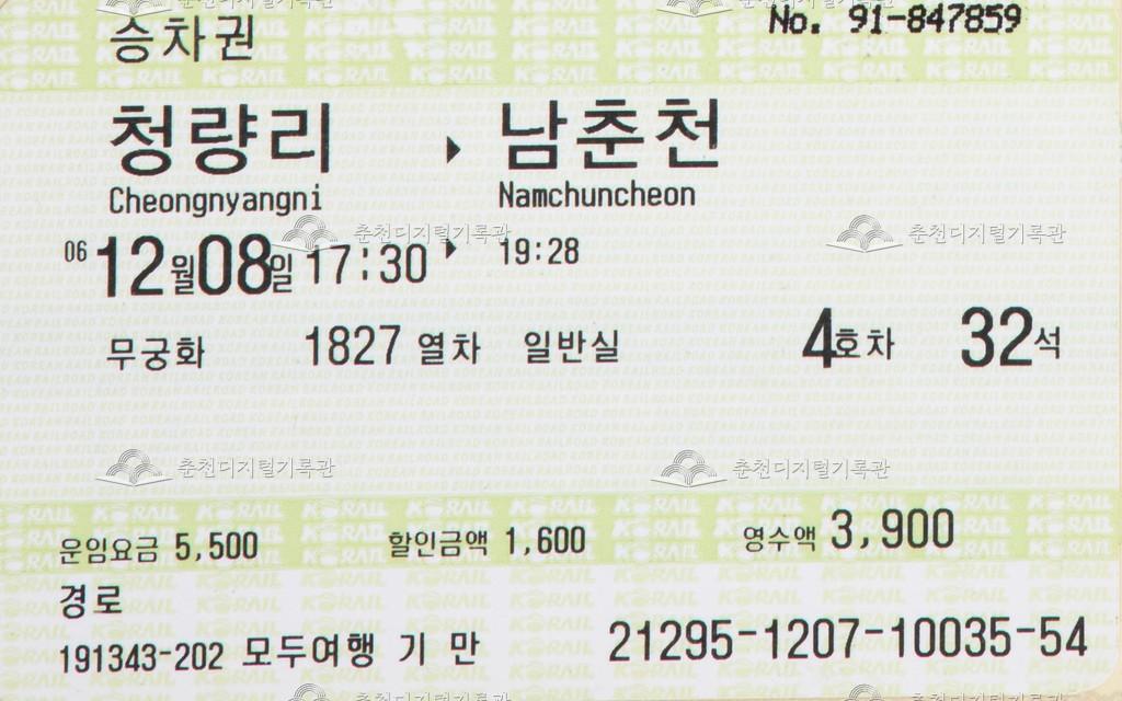 무궁화호 승차권 : 청량리-남춘천 경로 등록번호 00005152 생산일자 2006.12.08 생산지역 춘천시 생산자 한국철도공사 수집처 최윤석 소장자 최윤석 내용 MS 승차권이라고도 불리는 자성승차권이다. 열차 등급은 무궁화호로 청량리-남춘천 경로할인 승차권이다. 다수의 조그만 'KORAIL'의 로고가 보인다. 자세히 보기 닫기 사용안내 비상업적 이용만 가능|©춘천디지털기록관 상업적 사용·수정·재배포는 저작권자 동의 필요 다운로드 목록보기