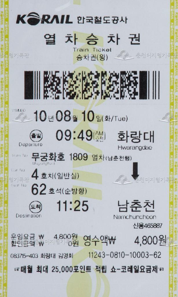 무궁화호 승차권 : 화랑대-남춘천 등록번호 00005185 생산일자 2010.08.10 생산지역 춘천시 생산자 한국철도공사 수집처 최윤석 소장자 최윤석 내용 바코드형 승차권이다. 열차 등급은 무궁화호로 화랑대-남춘천 승차권이다. 사용안내 비상업적 이용만 가능|©춘천디지털기록관 상업적 사용·수정·재배포는 저작권자 동의 필요 다운로드 목록보기