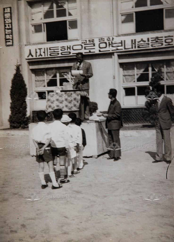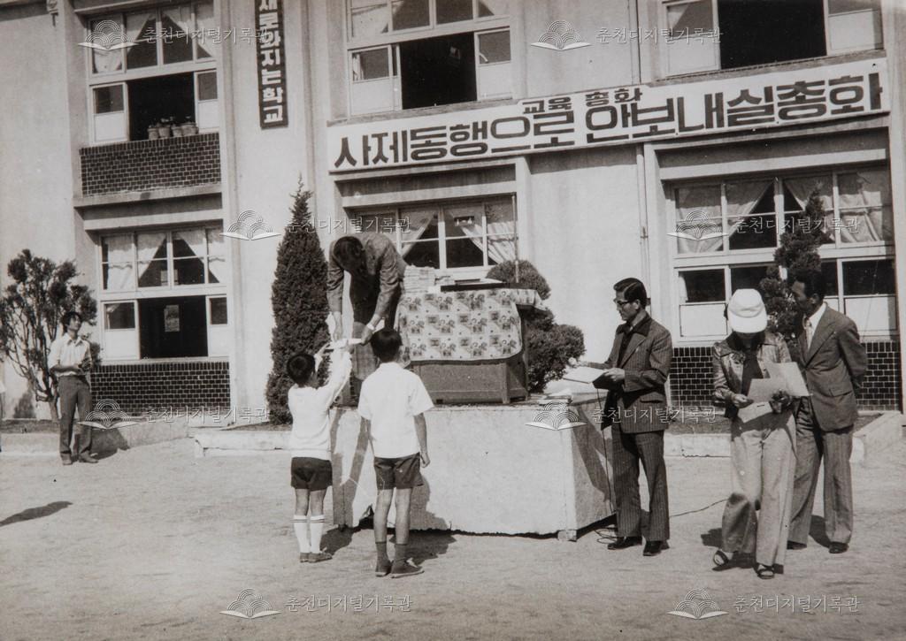 1977년 5월 7일 근화국민학교(현재 근화초등학교)에서 강원일보 사생대회 입상자들을 시상하고 있다.