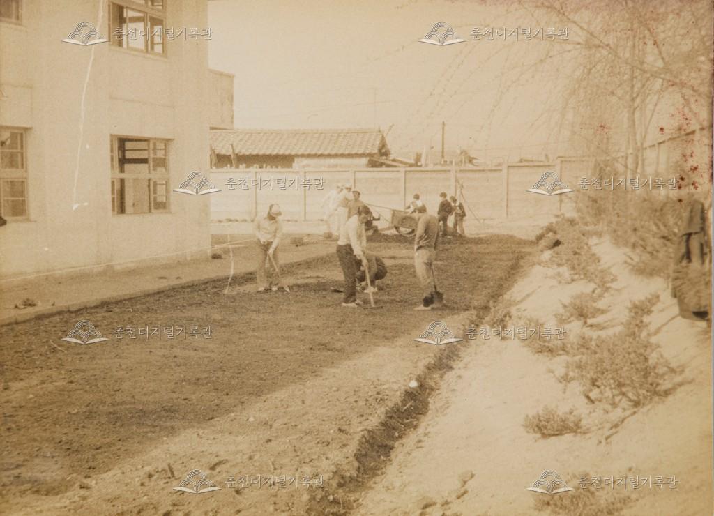 1978년 근화국민학교(현재 근화초등학교) C동 교사 뒤에 화훼원을 만드는 모습이다.