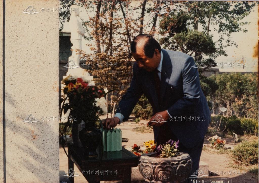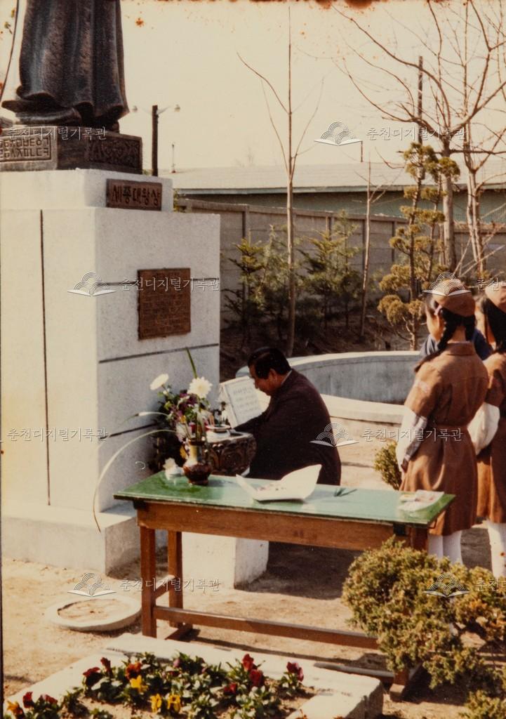 1981년 근화국민학교(현재 근화초등학교)에서 세종대왕 동상에 헌화하고 있다.