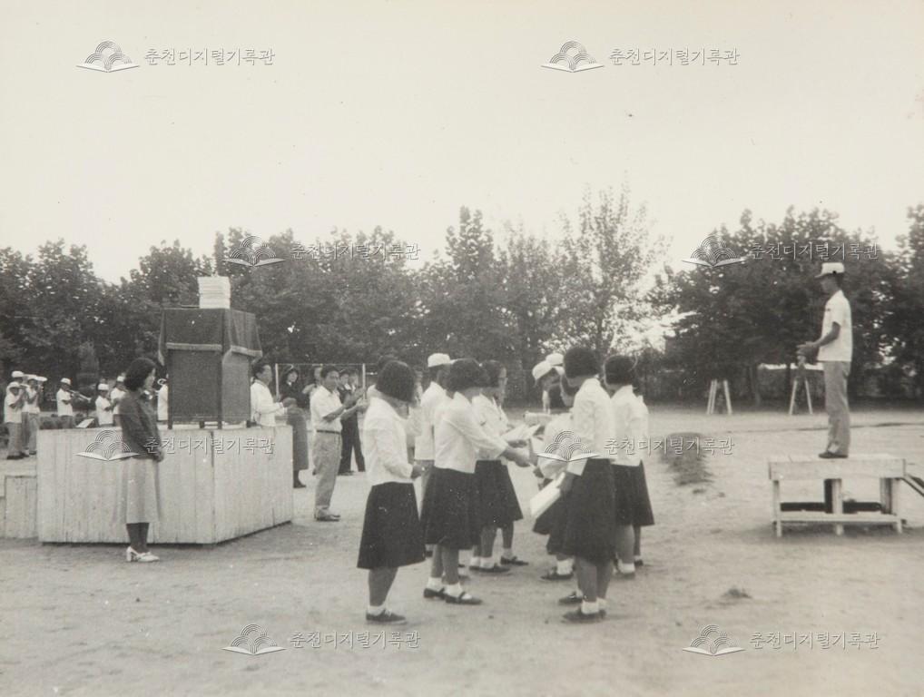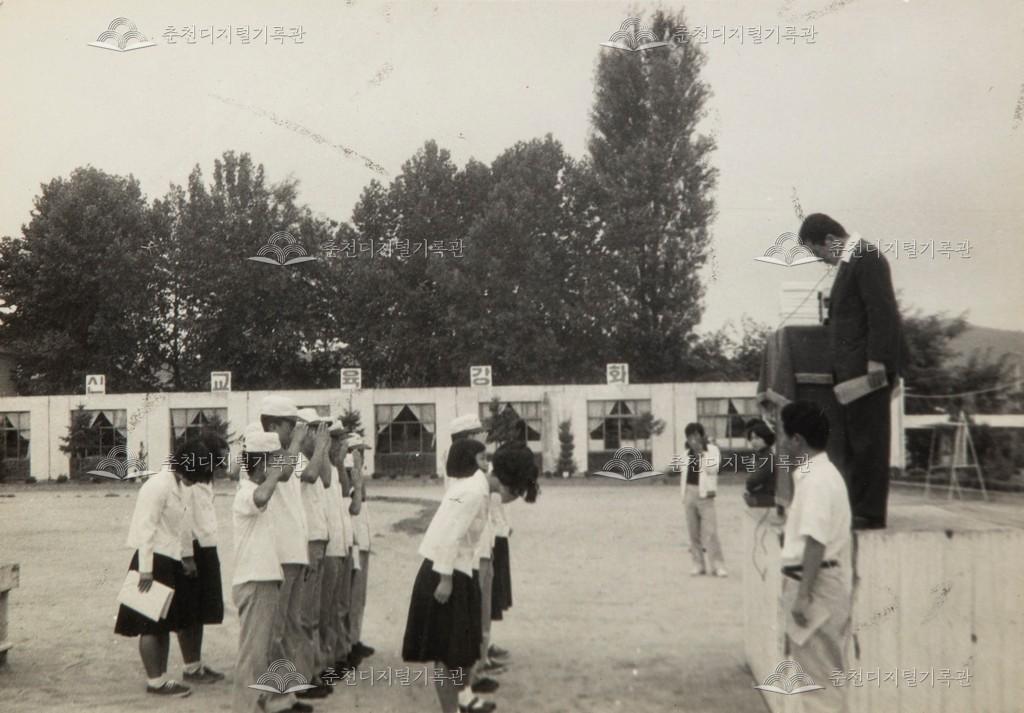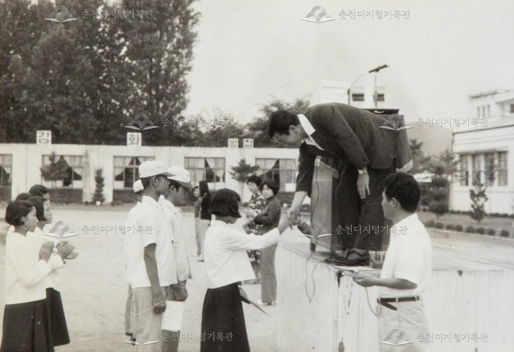 춘성중학교에서 근검절약하는 학생들을 표창하고 있다.