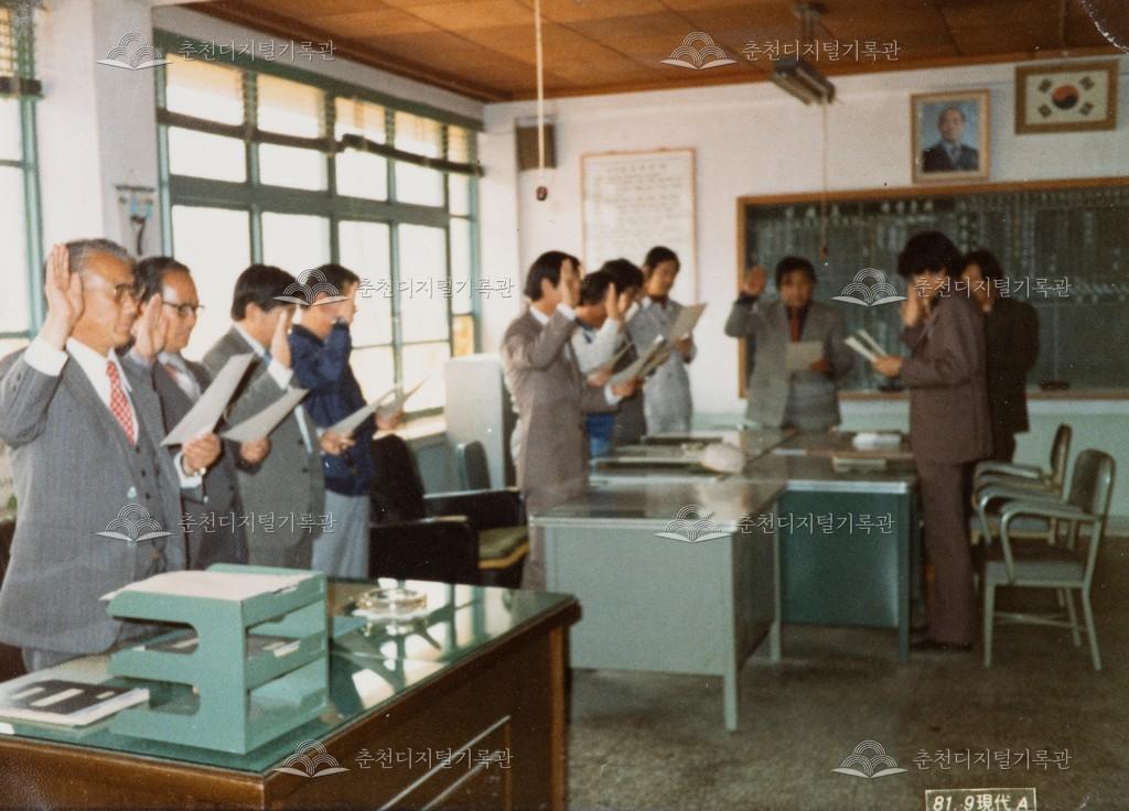 1981년 춘성중학교 교직원들이 선서하고 있다.