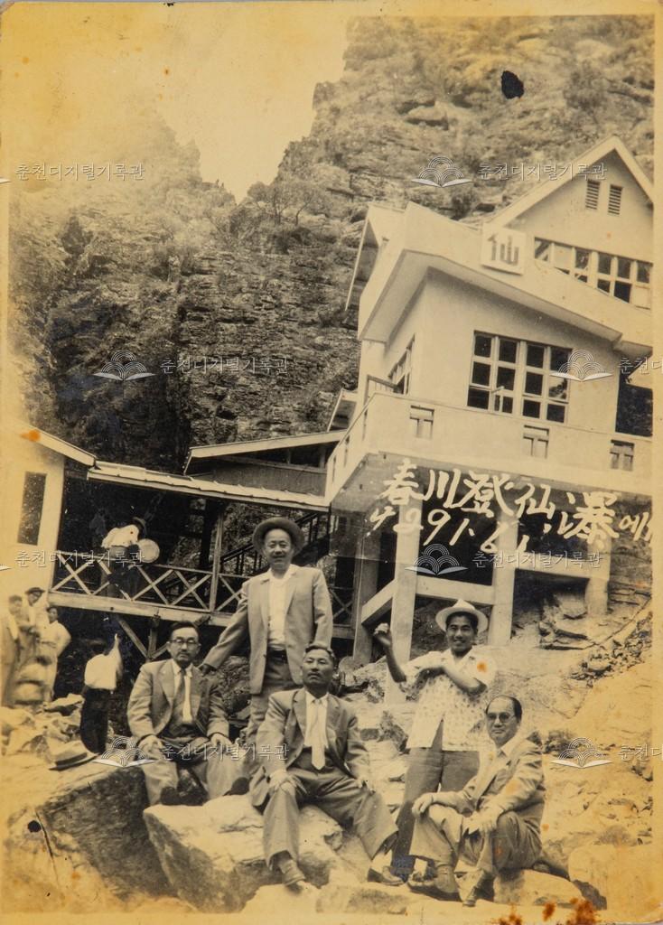 1958년 6월 1일 서면 덕두원리 등선폭포 입구에서 촬영된 기념사진이다. 당시 바위에 건축된 등선휴게소는 지금도 형태를 유지하고 운영되고 있다.