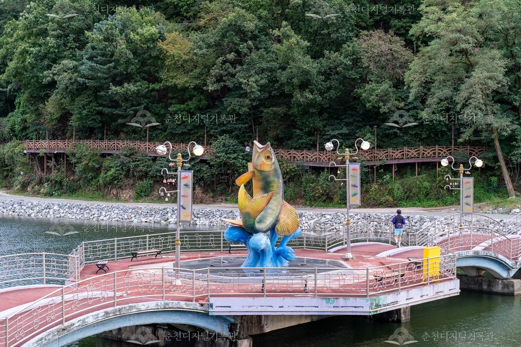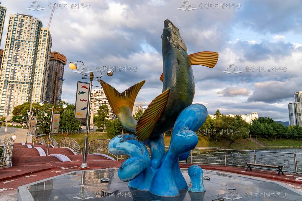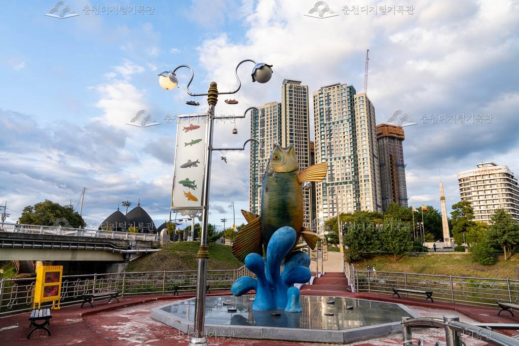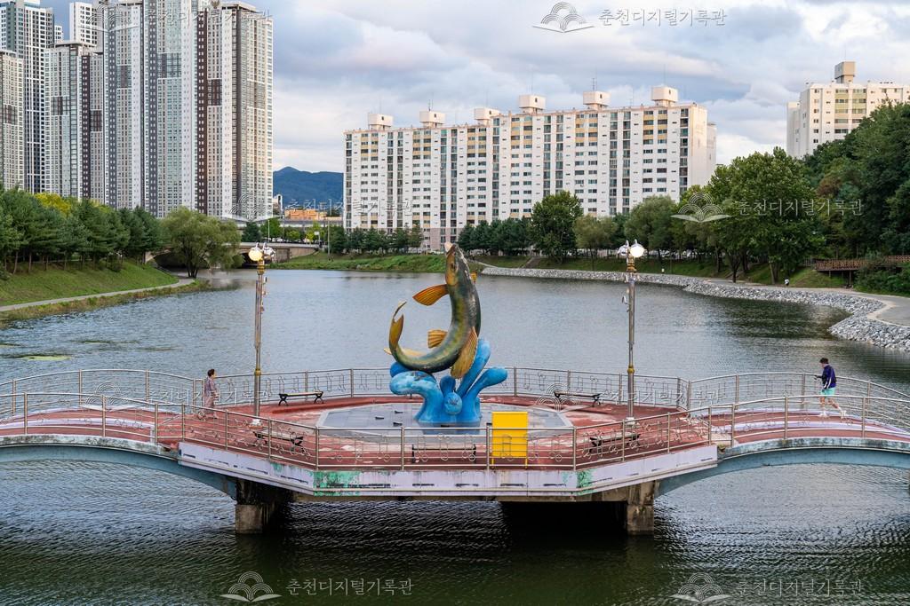 일명 호수의 집으로 불렸던 공지천교 옆의 팔각정은 춘천의 상징 중에 하나였다. 하지만 공치천의 환경정비 사업이 추진되면서 팔각정 음식점의 오폐수 문제가 불거지면서 팔각정의 철거가 확정되었다. 공지천에 있던 팔각정이 2002년 철거되면서 그 자리에 세워진 황금 쏘가리상 모습이다. [출처] 강남동 마을지