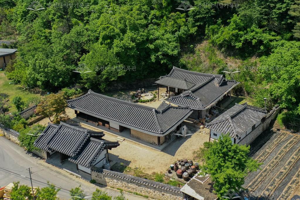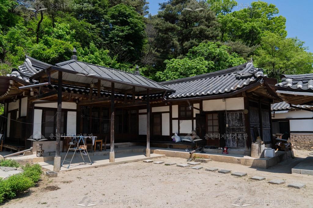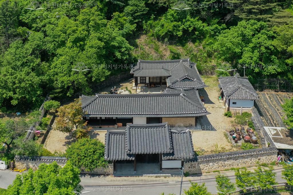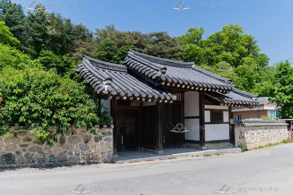 강원특별자치도 문화유산자료인 김정은 전통가옥은 솟을 대문을 중심으로 사랑채가 연결되어 있는데 대문을 중심으로 좌측에는 부엌과 사랑방이 우측에는 광이 있고 그 뒤쪽으로 방이 있다. 일반적인 가옥과는 달리 대청과 건넌방의 전면에 3개의 팔각 주축돌을 놓고 그 위에 목재로 만든 원형의 기둥을 세우고 지붕에 잇대어 함석으로 만든 차양을 설치하였다. 민가에 함석의 차양이 따로 설치된 것은 흔치 않은 것으로 강원 지역 내에서는 강릉선교장 안의 열화당과 이곳뿐이다. [출처] 신동면 마을지
