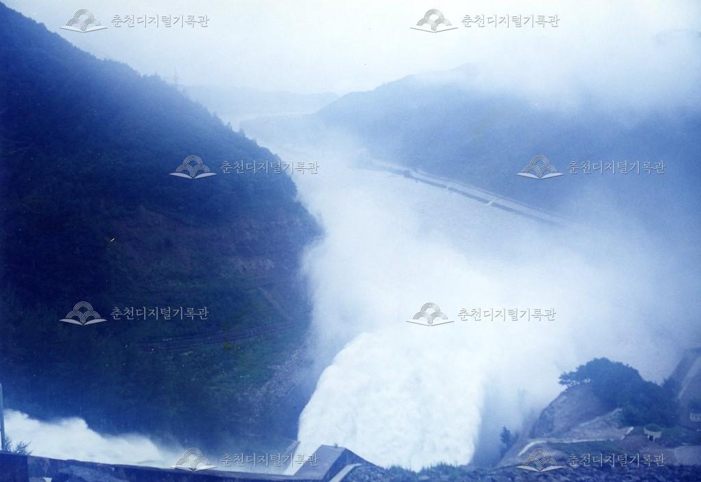 소양강댐 방류 사진 등록번호 00000681 생산일자 1995.08.24 생산지역 춘천시 북산면 청평리 생산자 오일주 수집처 오일주 소장자 춘천학연구소 내용 1995년에 촬영한 소양강댐 방류 사진이다. 1995년 8월, 춘천지방에 태풍 재니스의 영향으로 사흘간 300mm가 넘는 기록적인 폭우가 내렸고 소양강댐은 1990년 이후 5년 만에 수문을 열었다. 수문은 24일에 개문, 31일에 폐문했다. 자세히 보기 닫기 사용안내 비상업적 이용만 가능|©춘천디지털기록관 상업적 사용·수정·재배포는 저작권자 동의 필요 다운로드 목록보기