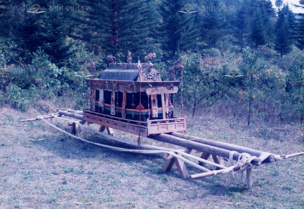 1982년 중요민속자료 120호로 지정된 청풍부원군 김우명 상여의 사진이다. 조선 숙종 시기 만들어진 것으로 지금까지 내려오는 상여 중 가장 오랜된 것이다. 해당 상여는 서면 안보리 김우명 묘역 상여막에 보관되어 있다가 2002년 국립춘천박물관 개관 때 기증되었다. 사진은 1995년에 촬영했다.