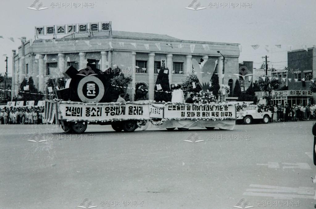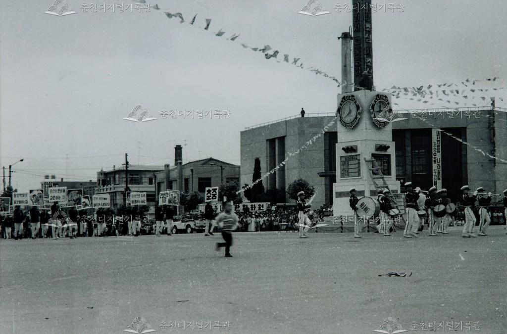 1968년 5월 30일에 개최된 제3회 개나리문화제(현재 소양강문화제)의 시가 행렬 사진이다. 춘천중학교 브라스 밴드가 중앙로 로터리를 지나는 모습(첫 번째 사진), 제1중학교 여학생을 태운 무개차(두 번째 사진), 브라스 밴드 뒤로 중앙로 로터리에 입장하는 성수중고등학교 가장행렬대(세 번째 사진)를 볼 수 있다. 세 번째 사진 좌측의 군장점은 지금도 운영되고 있는 <전우사>이다. 무개차 주변에 '증산', '건설의 종소리 우렁차게 울려라', '선조들의 얼 이어 대대로 가꾼 땅, 힘 모아 땀 흘여 옥토 이루자' 등의 캐치프레이즈가 당시 농업 생산, 도시개발의 상황을 짐작하게 한다.