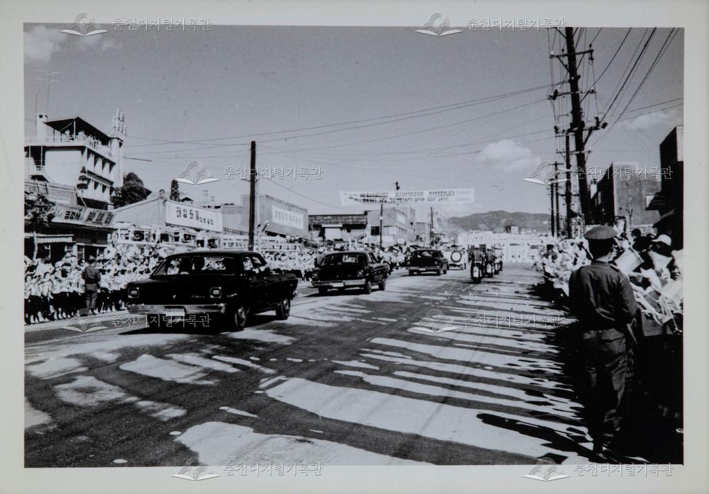 1968년 5월 19일 에티오피아 황제 하일레 셀라시에가 춘천을 방문, 이를 환영하는 인파의 사진이다. 소양로3가에서 중앙로터리 방면으로 여러 대의 차량이 이동하고 있다. "춘천시민은 황제폐하를 환영합니다"라는 문구가 쓰여있는 현수막이 보인다.