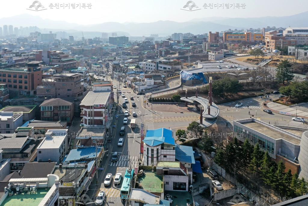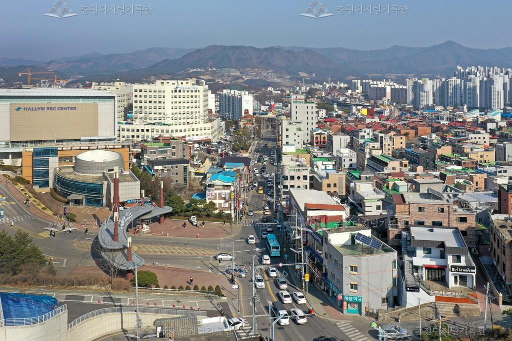 교동 한림대학교 정문 삼거리 사진이다. 한림대학교 전경, 춘천성심병원, 봉의산, 유봉여자중학교, 유봉여자고등학교가 보인다.