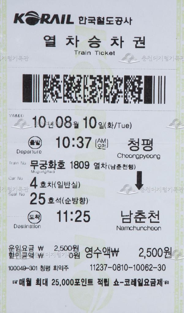 무궁화호 승차권 : 청평-남춘천 등록번호 00005207 생산일자 2010.08.10 생산지역 춘천시 생산자 한국철도공사 수집처 최윤석 소장자 최윤석 내용 바코드형 승차권이다. 열차 등급은 무궁화호로 청평-남춘천 승차권이다. 사용안내 비상업적 이용만 가능|©춘천디지털기록관 상업적 사용·수정·재배포는 저작권자 동의 필요 다운로드 목록보기