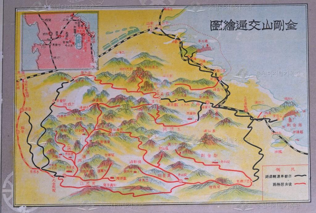 강원도 현세지도(1936.7.15.동아일보 부록)에 실려있는 금강산교통회도이다. 금강산 관람에 필요한 철도노선, 자동차운전도로, 도보탐승로, 주요 지명 등을 그림 지도로 그렸다.