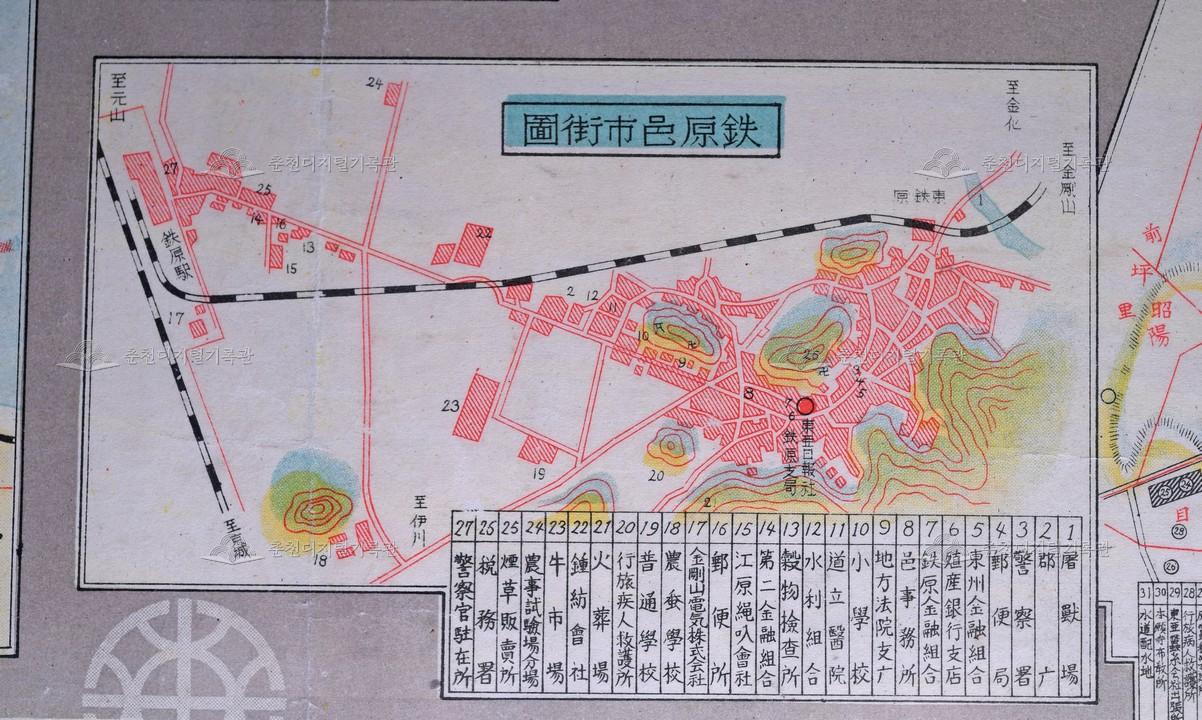 강원도 현세지도(1936.7.15.동아일보 부록)에 실려있는 철원읍시가도이다. 철원읍내 주요 관공서, 학교 등의 위치를 기재하고 있다.